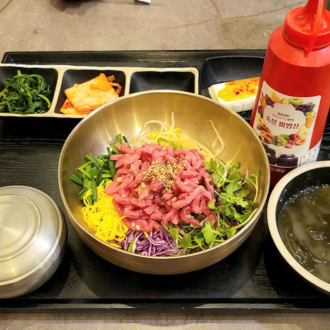 메뉴판 사진과는 다소 다르지만 여러가지 고명위에 육회가 올라가 있습니다.