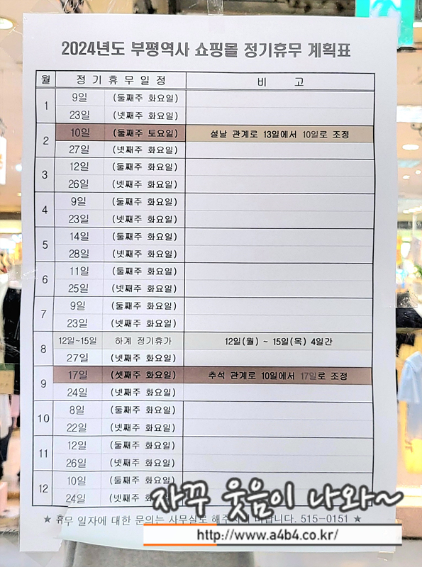 2024년 부평역 지하상가 휴일은 아래와 같습니다. 기본 월 2주 4주 화요일 휴우인데요.