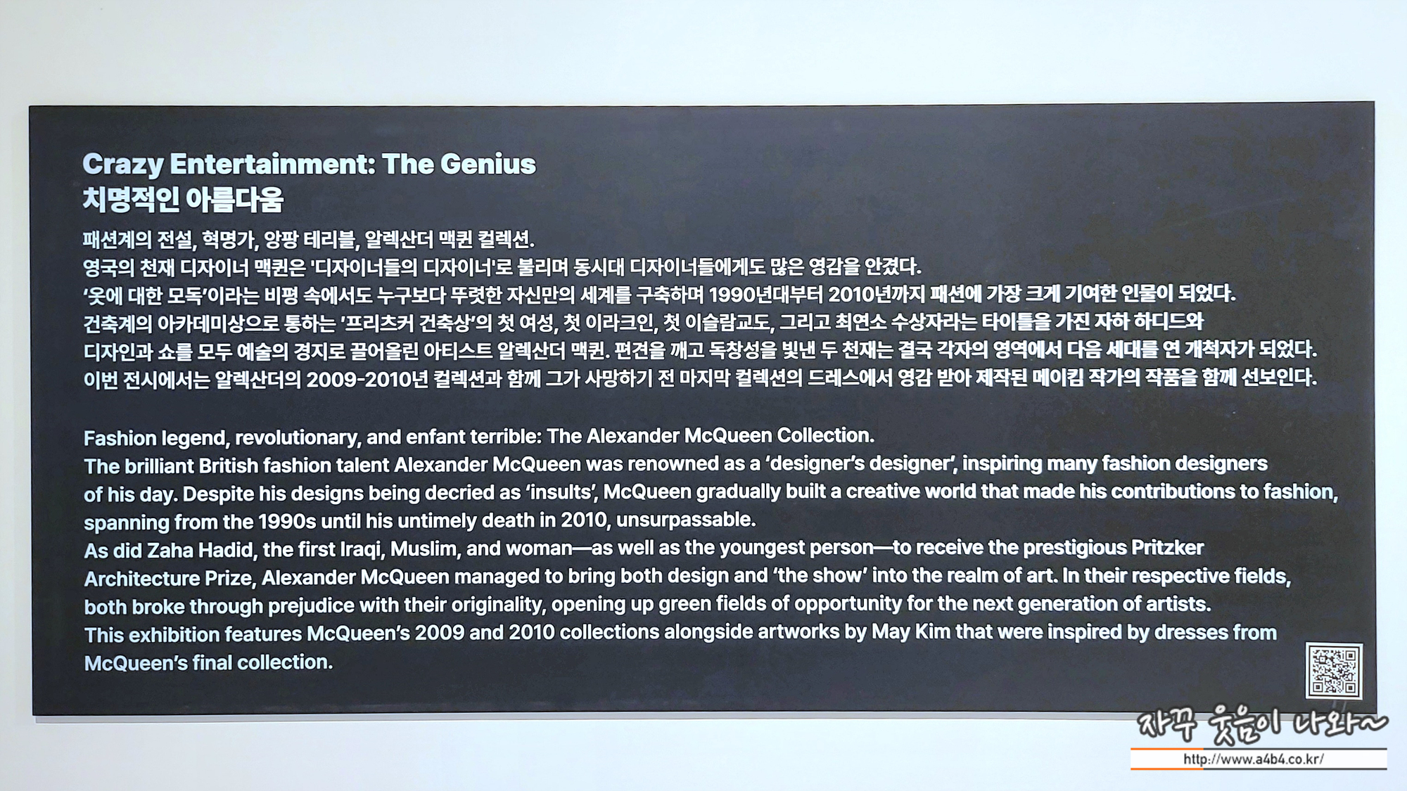 RSVP: 위대한 유산으로의 초대 ‘Crazy Entertainment(치명적인 아름다움)’은 패션계의 전설이자 혁명가였던 알렉산더 맥퀸 컬렉션을 선보입니다. 특히 알렉산더 맥퀸의 첫 번째 지방시 컬렉션을 위한 스케치와 2010년 그가 사망하기 전 마지막으로 선보인 컬렉션의 디지털 프린트 드레스가 공개됩니다. 이 공간에서는 알렉산더 맥퀸에게 영감을 받아 제작된 메이킴 작가의 미디어 아트도 주목할 만한 작품입니다.
