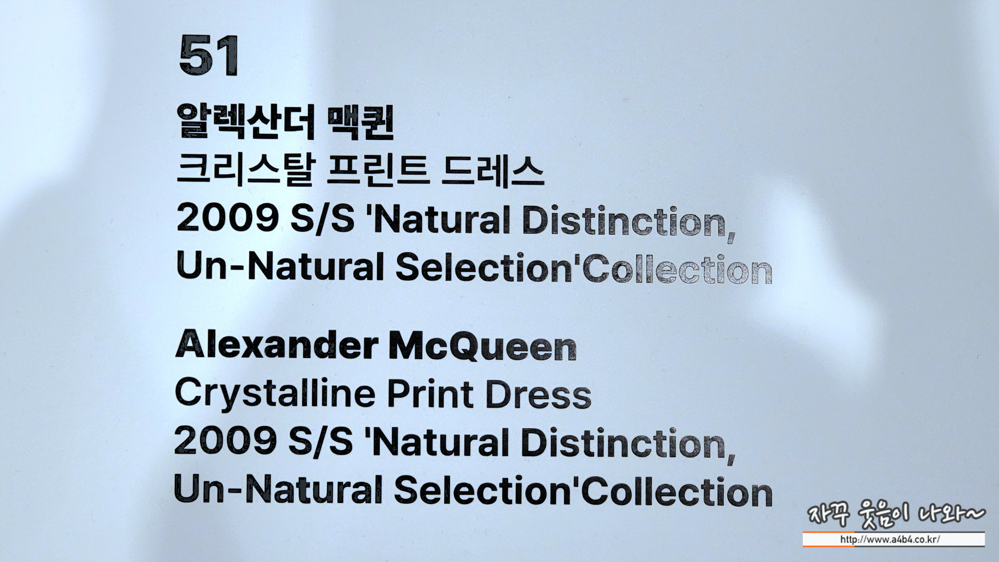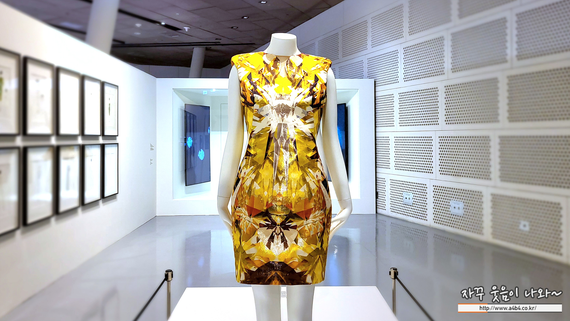 알렉산더 맥퀸이 사망하기 전 마지막 컬렉션의 드레스이다. 그가 그린 ‘플라톤의 아틀란티스’는 종말론적 미래 세계였다. 빙하가 녹은 해저 환경을 배경으로 모델들은 파충류와 양서류를 연상시키는 디지털 프린팅 드레스와 아르마딜로 슈즈를 신고 등장했다. 이는 맥퀸이 암시한 진화를 역전하여 모든 것이 탄생한 바다로 돌아간 생명체의 이미지였다. 죽음에 대한 동경을 넘어, 마치 고통과 죽음을 딛고 안식처를 찾은 불멸의 아름다움을 담은듯했다