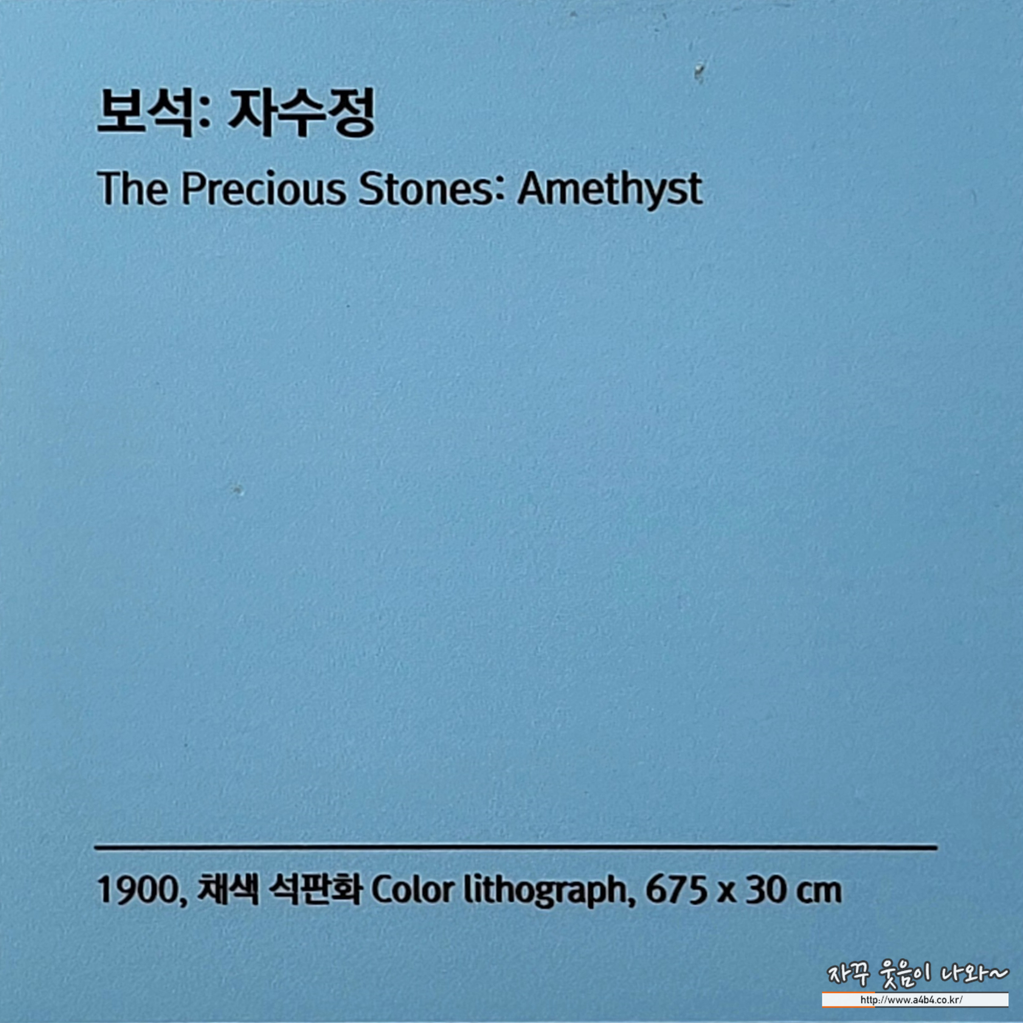 무하의 '보석 시리즈’를 구성하는 네 가지 보석을 의인화하여 <꿈꾸는 듯한 눈의 토 파즈>, <도도한 루비>, <당당한 자수정>, <신비스러운 에메랄드>를 표현했습니다. 작품의 상단에는 아름다운 여인의 형상 이 전반적인 구성을 이루고, 하단에 사실적으로 그려진 꽃으로 각 보석의 컬러를 구현하고 있습니다. 흘러내리는 드레스를 포 함하여 머리 장식, 모자이크 처리된 후광과 여인의 눈동자에도 각 보석의 색상이 아름답게 투영되어 있는 것을 보실 수 있습니 다.