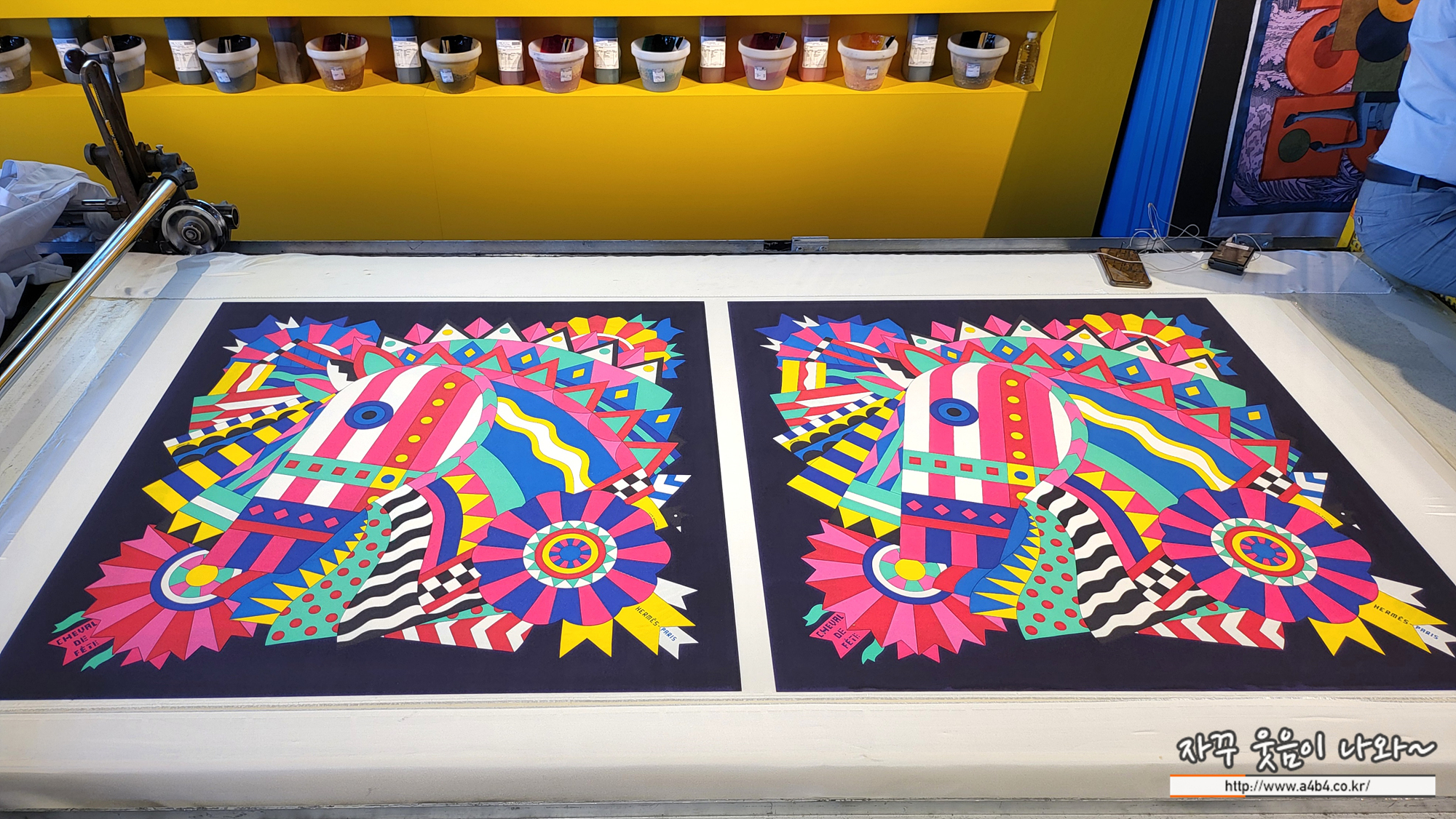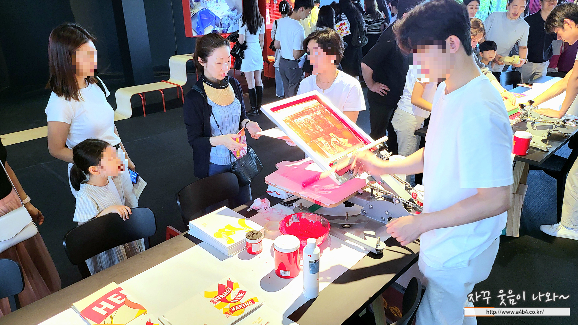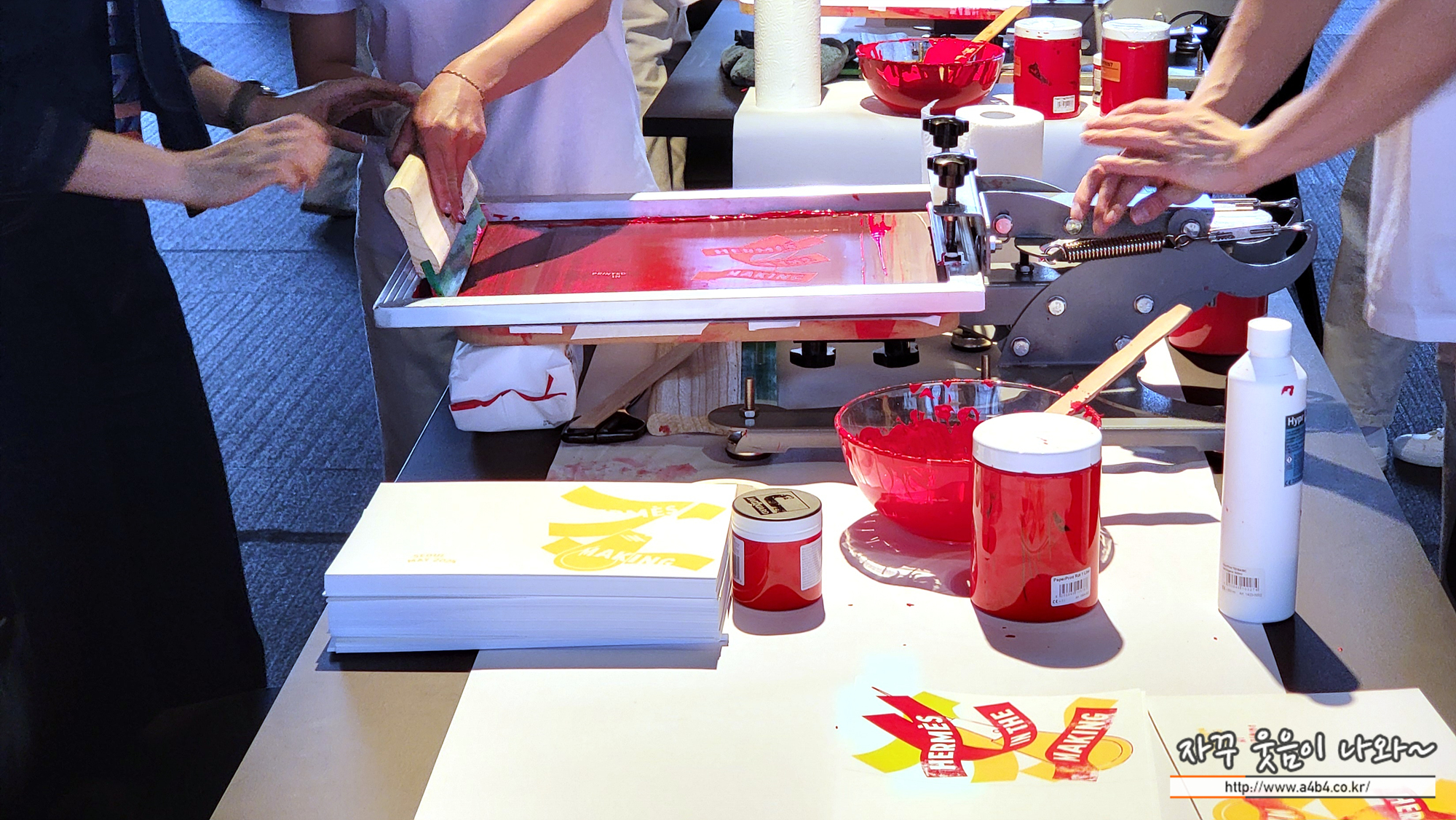 이번 에르메스 전시회의 특징 중 하나는 관람객이 체험할 수 있는 공간이 많이 준비되어 있습니다. 에르메스 패턴 컬러링 등 작품 디자인을 할 수 있는 공간도 마련되어 있고, 사진과 같이 실크스크린을 경험할 수 있는 공간도 준비되어 있습니다.