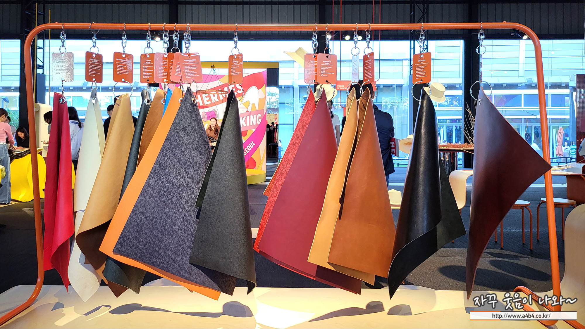 에르메스의 다양한 컬러와 질감, 촉감을 보여주는 가죽들, 직접 만지고 체험할 수 있는...