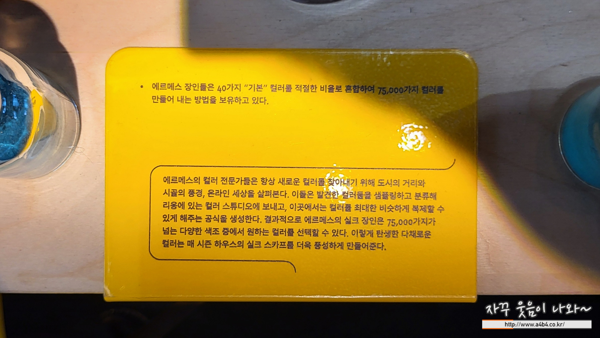 에르메스 안료의 배합에 대한 설명 40여가지 기본컬러의 밸리를 통해 75,000가지 컬러를 만들어낸다고 합니다.