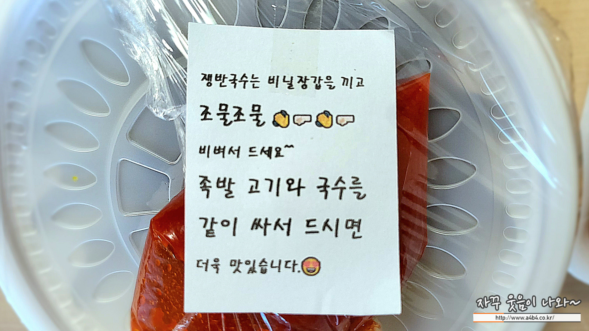 포장한 뚱뚱이할머니집 족발과 막국수 가지고 집으로 옵니다.