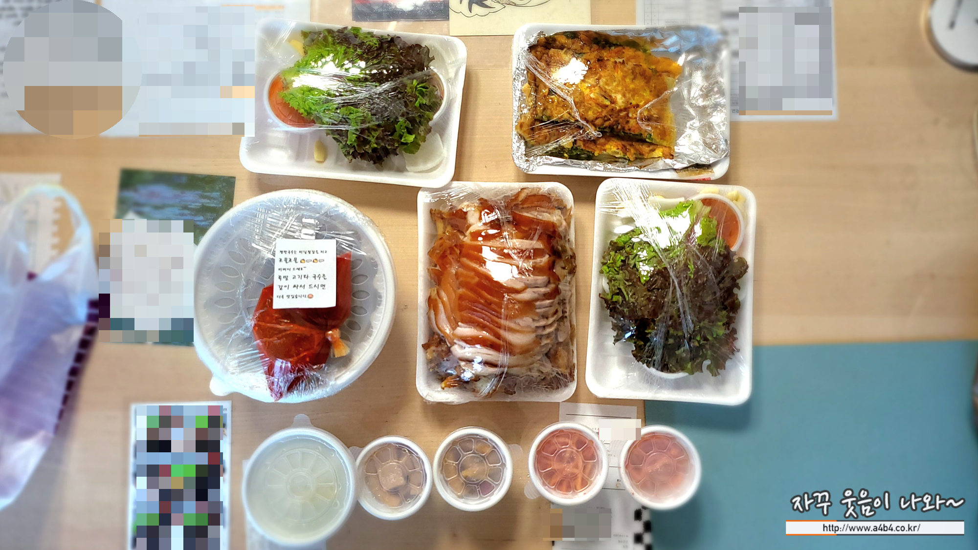 반찬은 간장에 절인무와 무채나물 쌈장, 상추, 그리고 양파와 마늘이 같이 포장되어있습니다. 새우젓은 없음