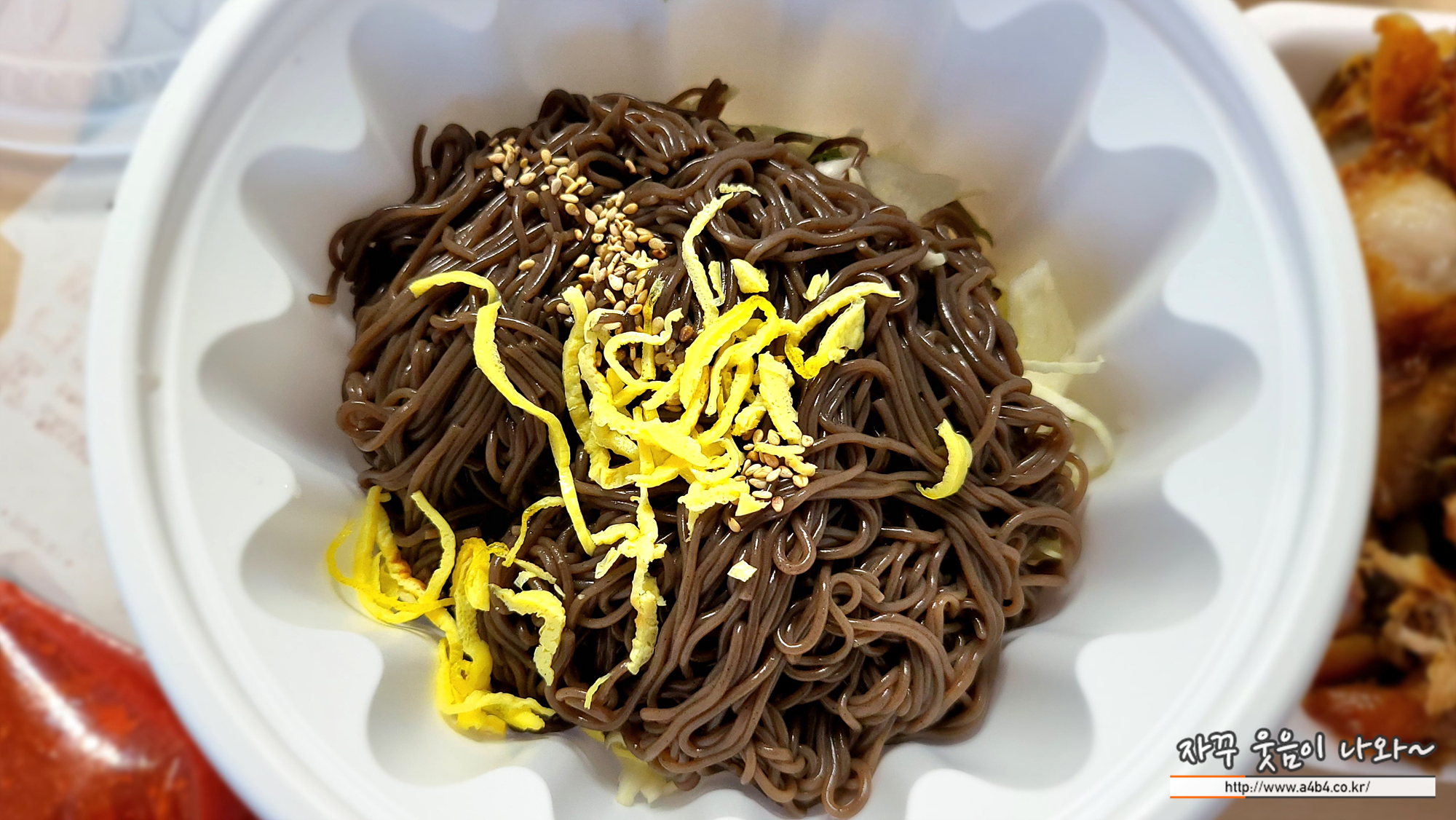 양은 1.5인분 정도 될 것 같습니다. 포장해서 오다 보니 국수가 뭉쳐 버렸는데요. 국수 아래쪽에는 양배추나 당근 등의 야채가 깔려 있습니다.