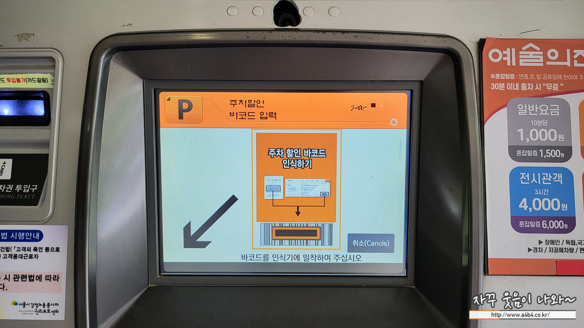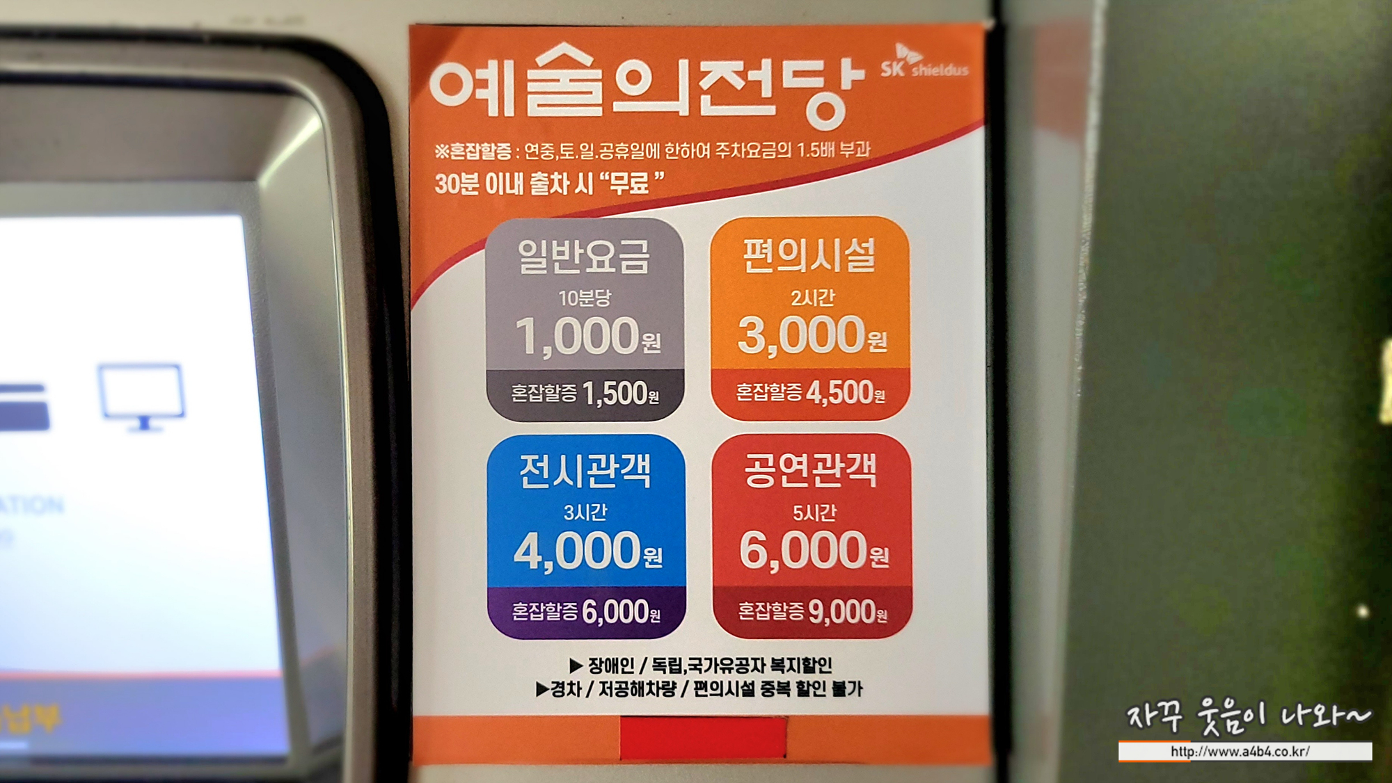 예술의 전당 곳곳에 사전 주차요금 정산기가 비치되어 있고요. 차량번호입력 후 할인처리하시면 됩니다.