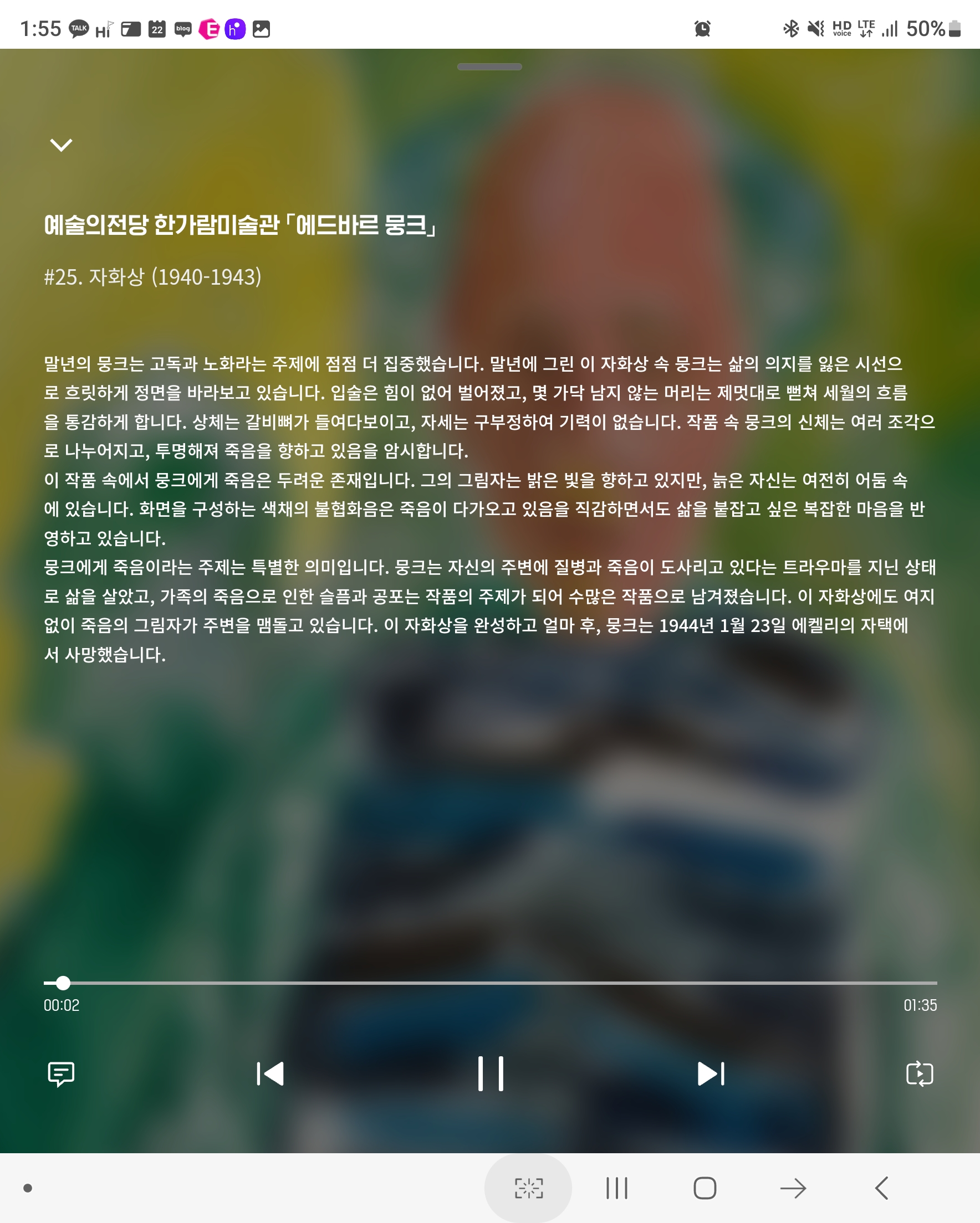 요즘 현대에서 문화예술 오디오가이드 신경 많이 쓰네요. 이번 뭉크전시회 오디오가이드도 H.포인트앱 오디오갤러리에서 이용이 가능합니다. 물론 3,000원 요금은 동일합니다만, 내 기기와 내 이어폰을 사용한다는 부분과 전시장 방문 및 발권 여부와 상관없이 이용이 가능한 부분이 더 큰 매력입니다.