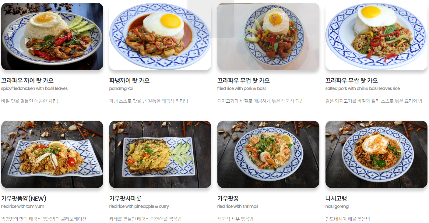 카우팟똠얌, 파인애플 볶음밥인 카우팟사파롯, 새우볶음밥인 카우팟꿍, 대표적인 인도네이시아 해물 볶음밥인 나시고랭, 태국식 게살 볶음밥인 카우팟뿌 등이 준비되어 있습니다.