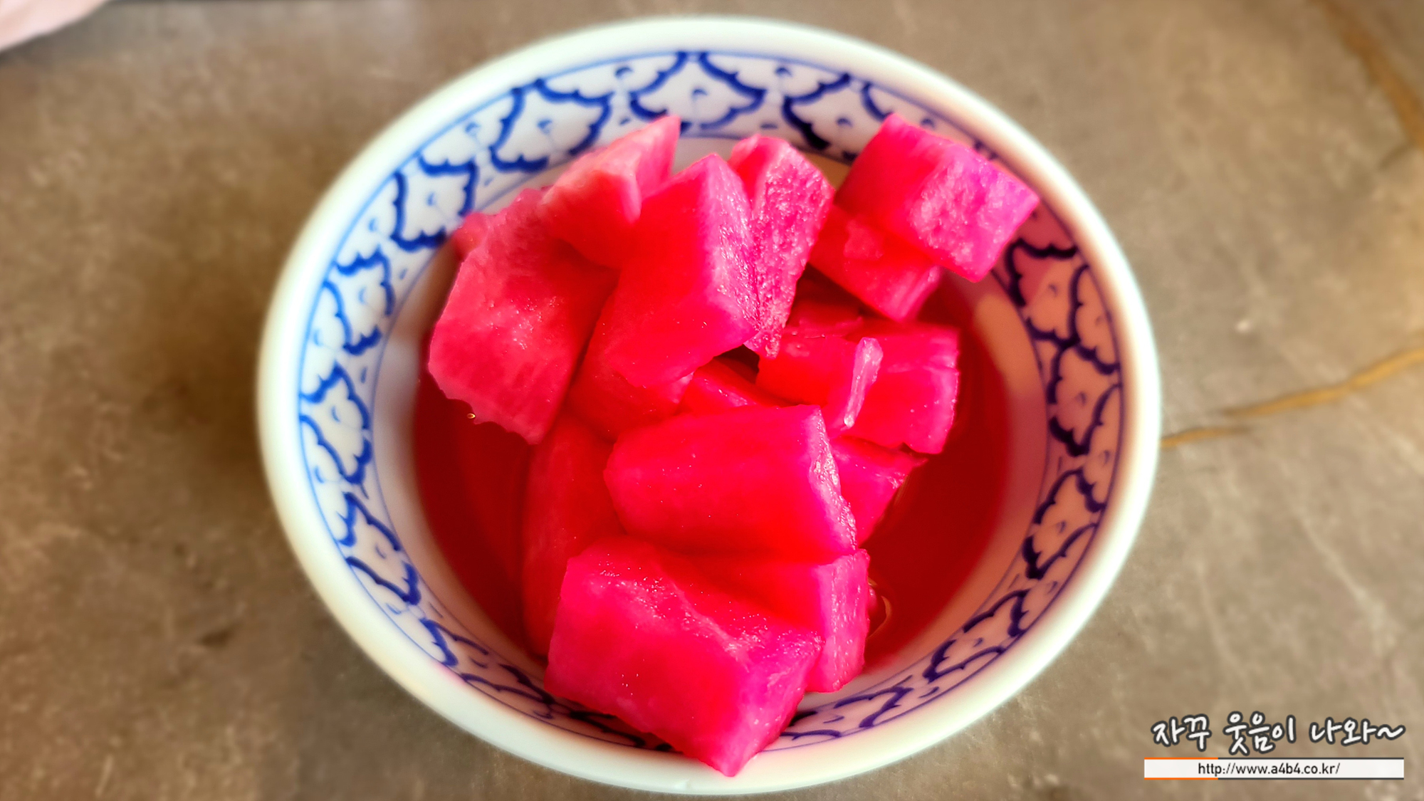 반찬은 무가 나오고요. 새콤달콤 상큼한 맛과 식감...