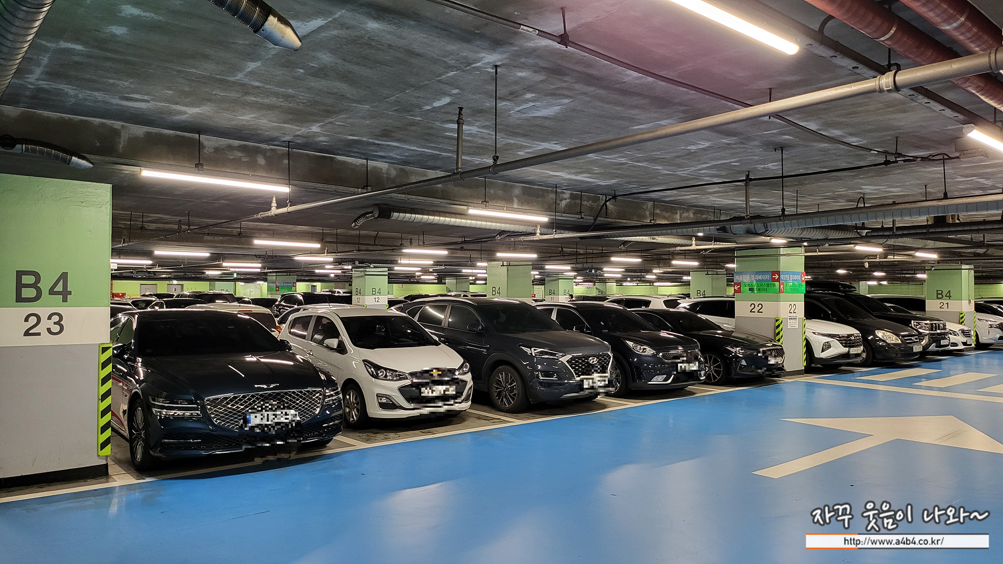 주차장 진출입구나 주차장 내부 공간은 넓직합니다. 초보자분도 주차하는데 큰 어려움은 없으며, 주차 난이도는 보통수준입니다. 차간 간격은 일반적인 수준으로 대형 차량이나 대형 SUV의 경우 옆의 차량에 따라 주차가 다소 어려울 수 있습니다.