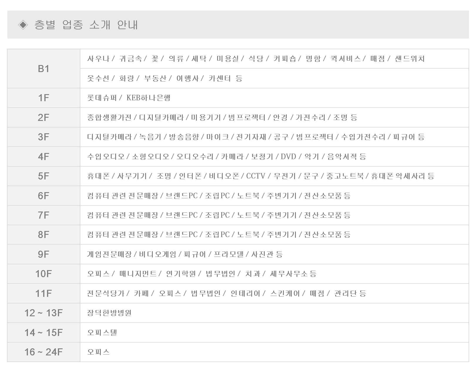 국제전자센터 입점업체는 가전, 디지털 카메라, 전자제품, 컴퓨터 부품등이 있고요. 이곳에서 가장 유명한 곳은 5층 휴대폰  성지와, 9층 게임전문매장과 프라모델, 피규어 판매점, 11층 전문식당가가 있습니다.