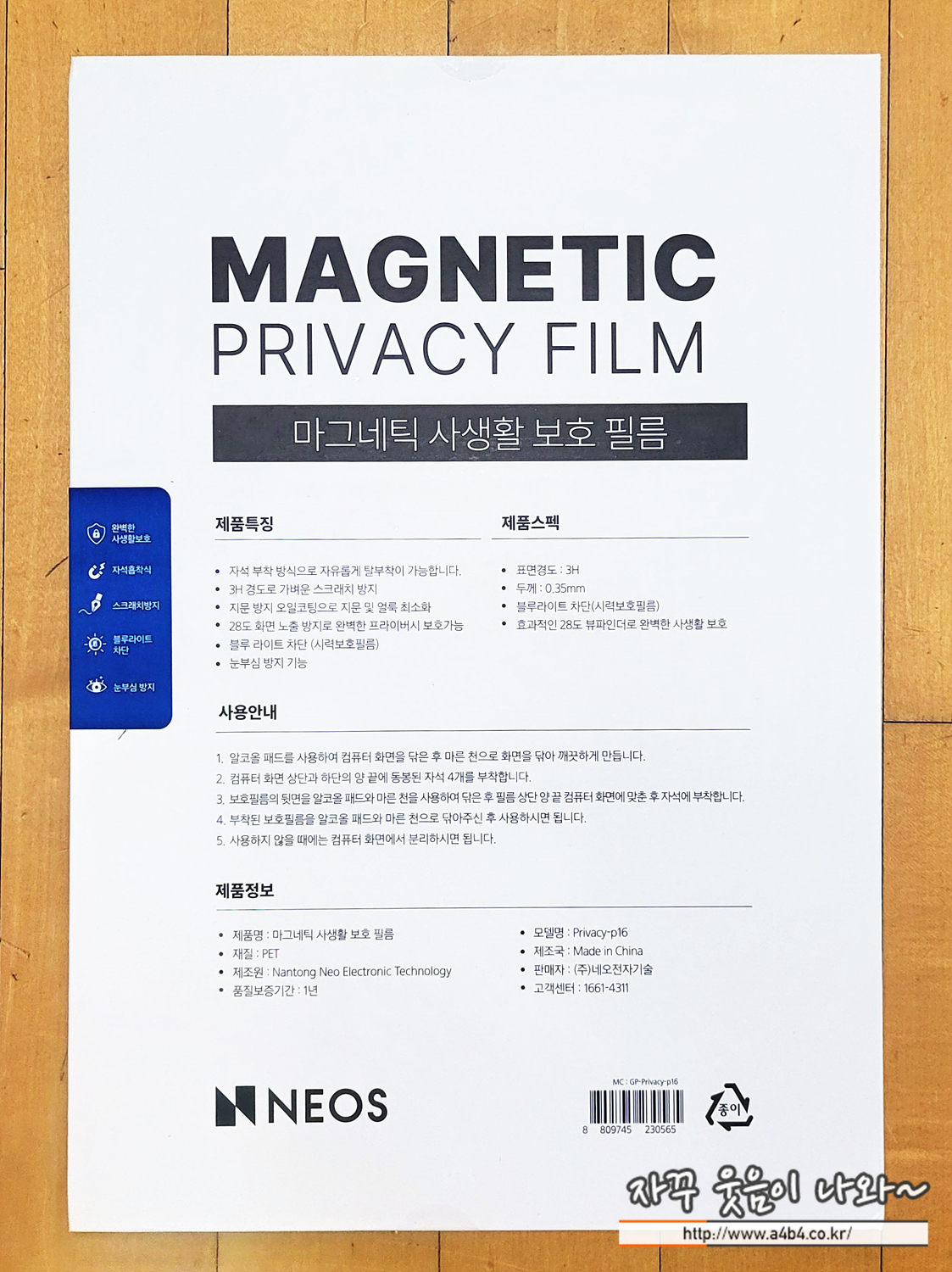 제품명은 neos 마그네틱 사생활 보호 필름으로 보안픨름 사이즈는 16인치 입니다. 16인치 갤럭시북에 최적화된 제품으로 저는 얼마전 갤헉시북5프로 360 모델을 구입하고, 갤럭시북 맴버스 사이트에서프로모션을 통해 구입했습니다.