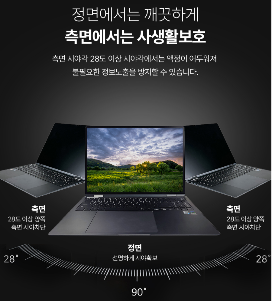 측면 시야각 28도 이상에서부터 액정이 어두워져 노트북 사생활보호 필름 기능이 작동 하는데요. 사진과 같이 시야각이 넓어지면서 점점 어두워지는 것을 보실 수 있습니다.