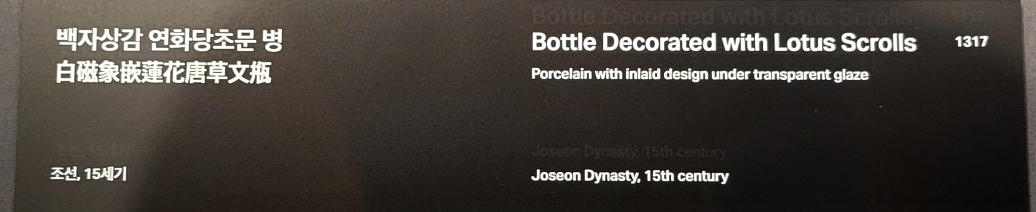 조선 초기 백자 중에는 고려 상감 기법의 전통이 녹아있는 ’흑상감 백자’라 부르는 부류가 있다. 이 작품은 흑상감 백자의 하나로 조선 초기의 전형적인 병에 덩물과 결합한 연꽃을 표현하였다. 구불구불 뻗어가는 덩굴의 움직임은 매우 가볍고 경쾌한 반면 중앙에 배치한 연꽃은 상감으로 흑색을 입혀 묵직하게 중심을 잡아주고 있다. 흰 바탕과 검은색 문양의 명료한 색 대비가 만들어내는 차분하고 정갈한 분위기가 일품이다.