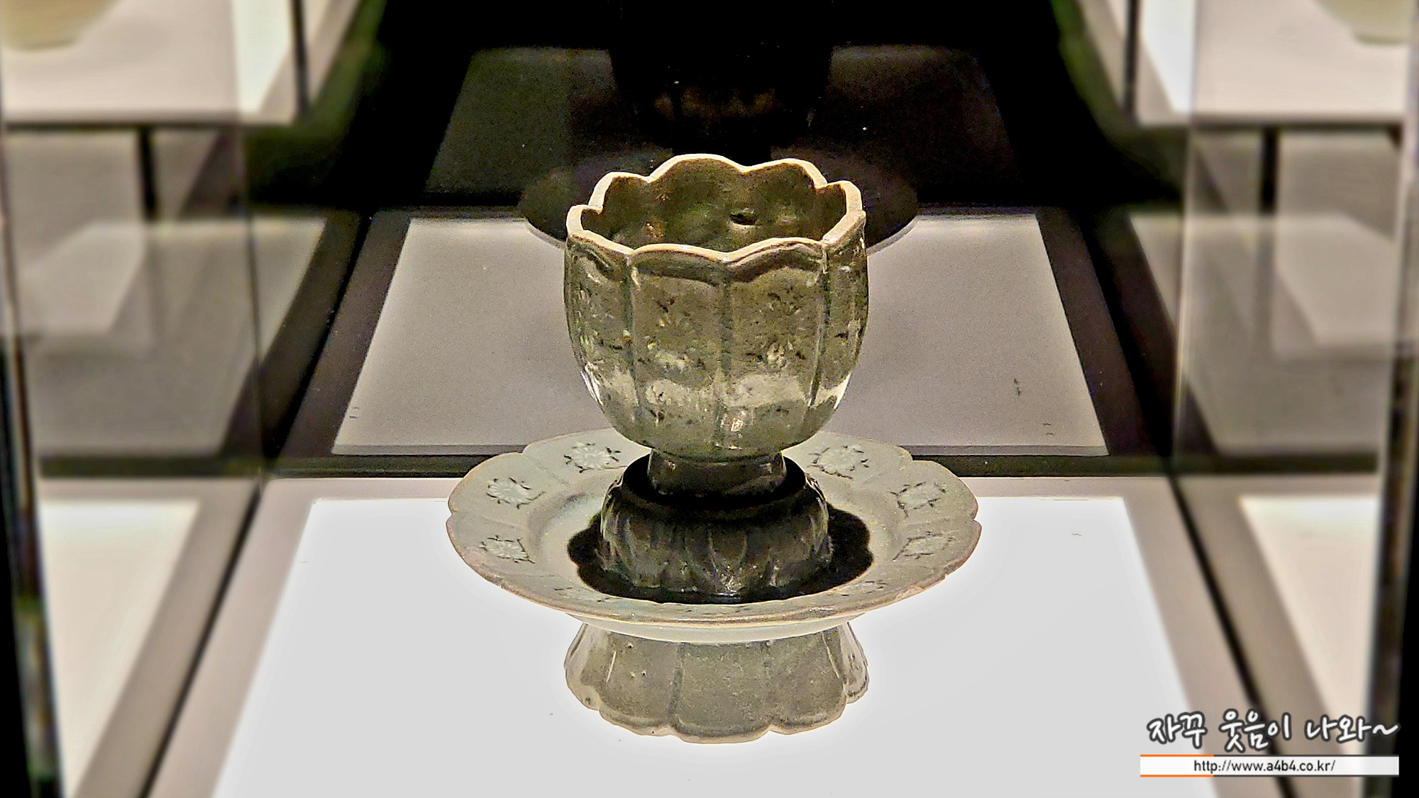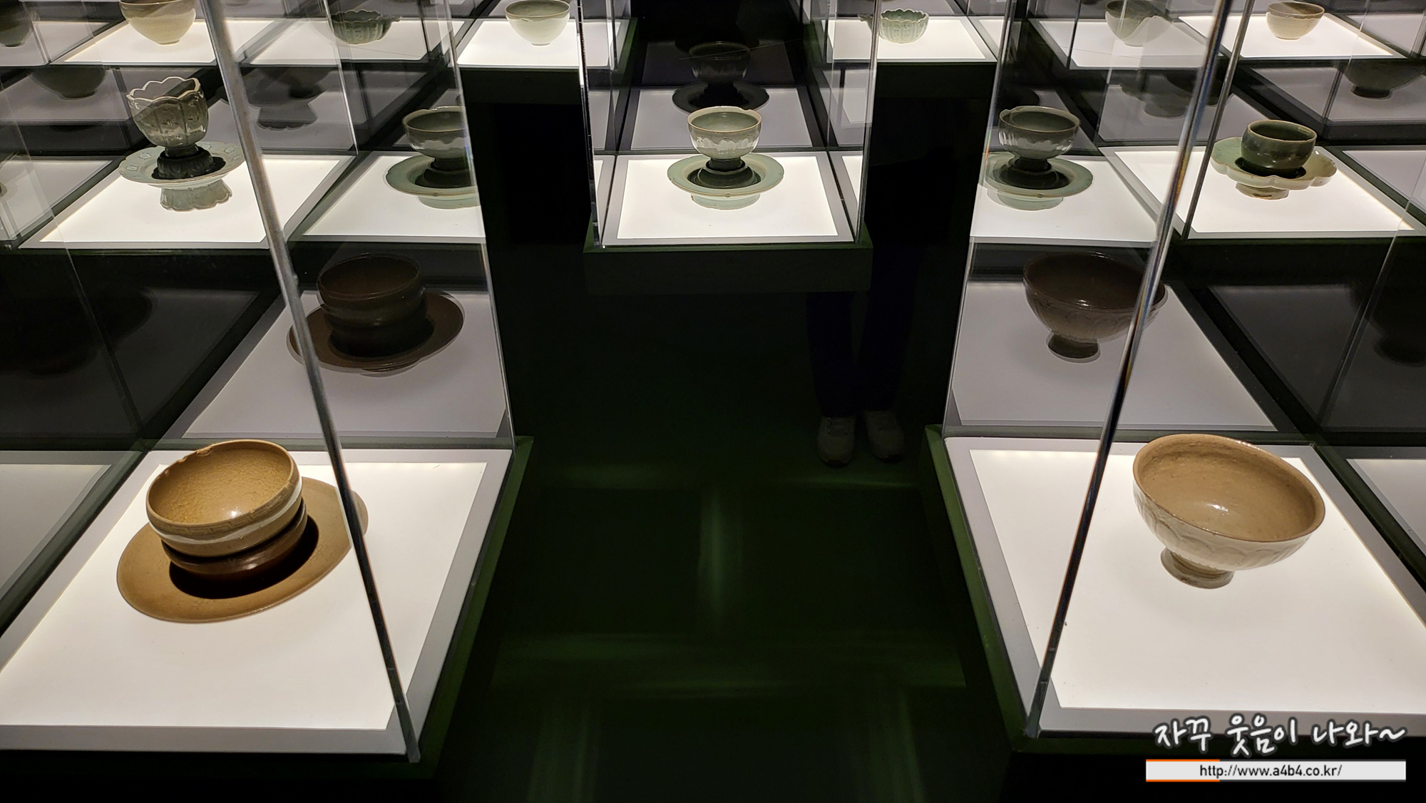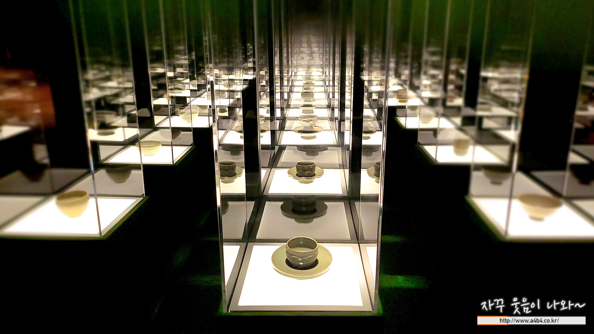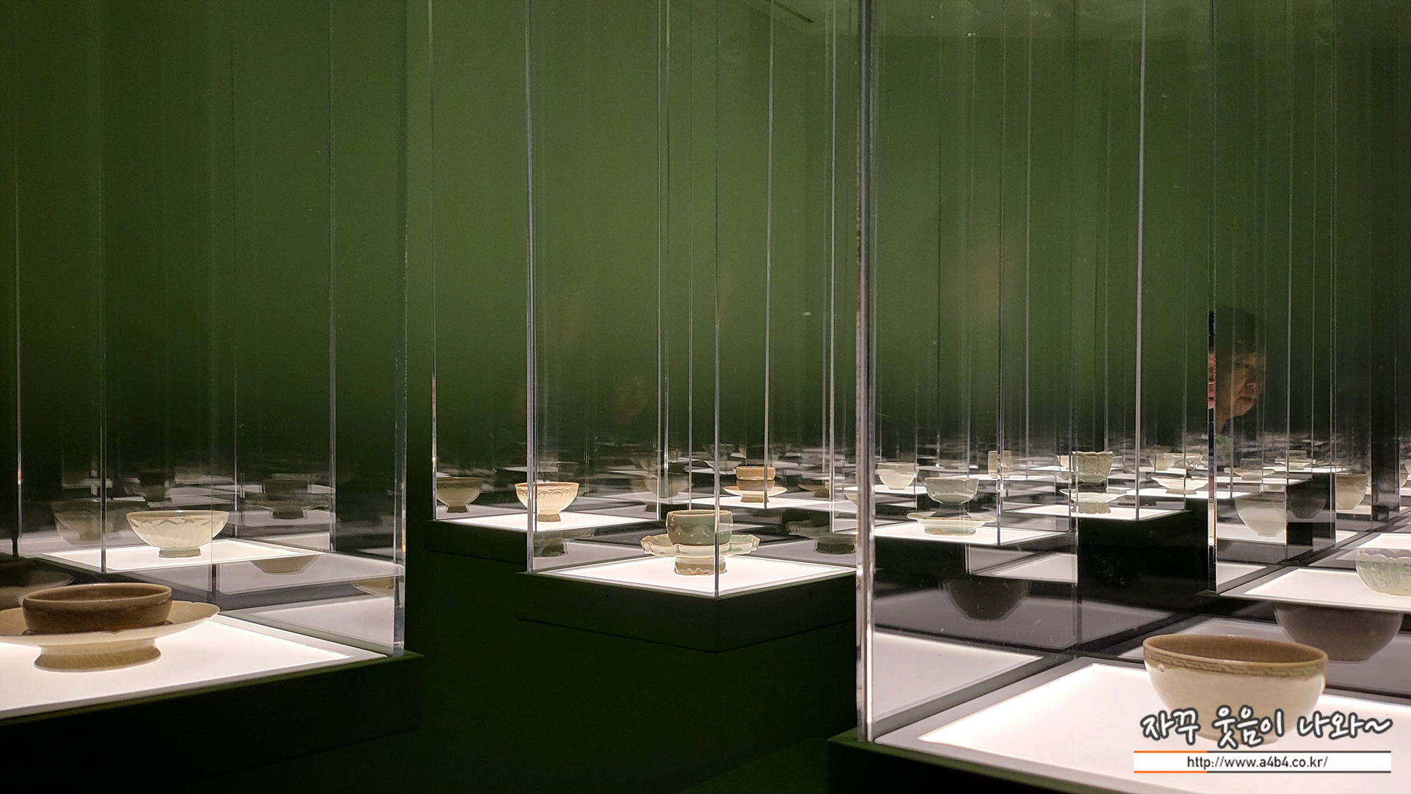 리움 미술관 M1 4F : 푸른빛 문양 한 점 전시관 한 공간에는 수십개의 청자 잔들이 전시되어 있습니다 어떤 잔은 가까이서 감상이 가능하지만 일부 작품은 거리를 두고 감상할 수 있습니다.