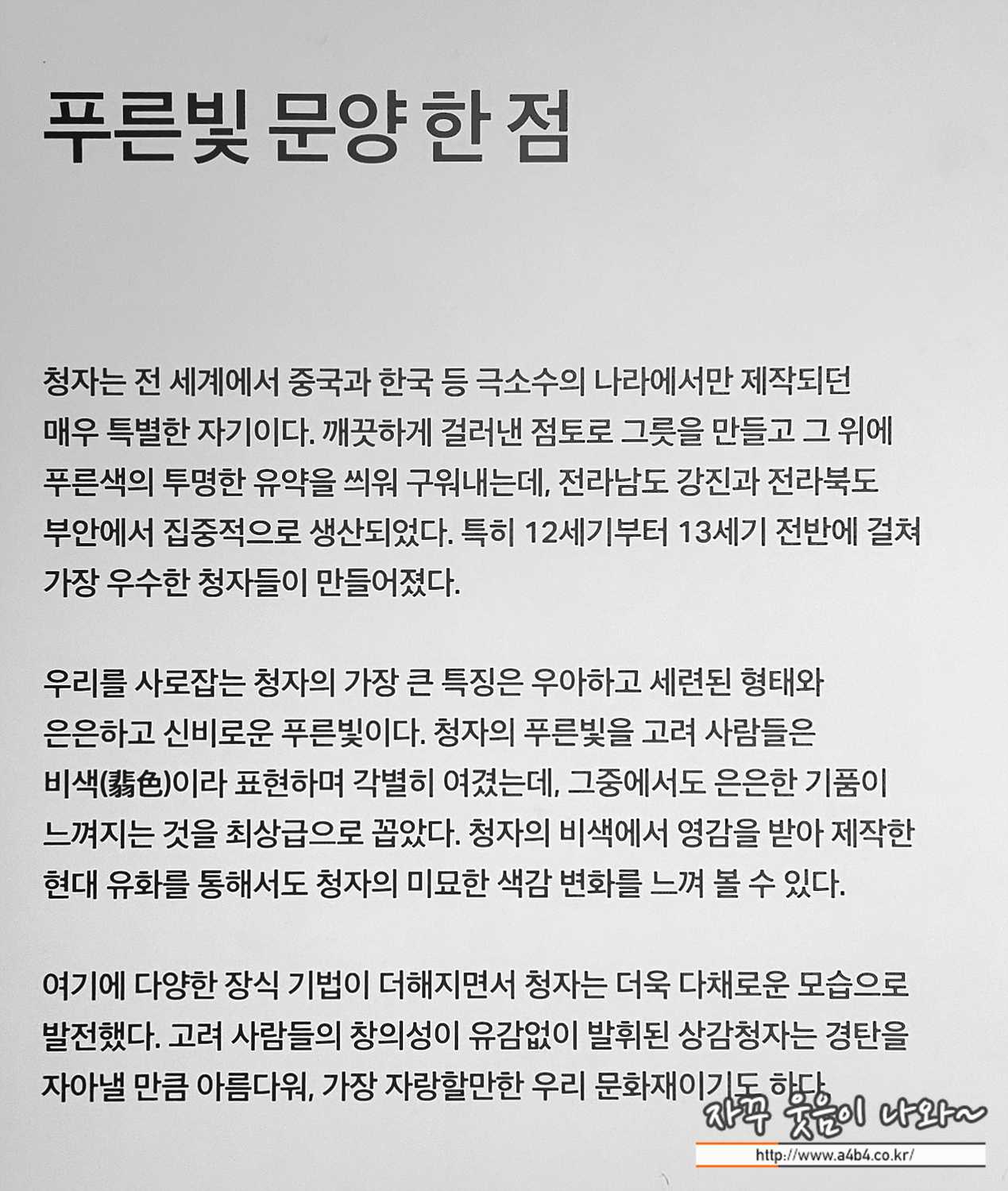 우리를 사로잡는 청자의 가장 큰: 특징은 우아하고 세련된 형태와 은은하고 신비로운 푸른빛이다. 청자의 푸른빛을 고려 사람들은 비색( 쓰)이라 표현하며 각별히:여겼는데, 그중에서도 은은한 기품이 느껴지는 것을 최상급으로 꼽았다. 청자의: 비색에서 영감을 받아 제작한 현대 유화를 통해서도 청자의 미묘한 색감 변화를 느껴 볼 수 있다.