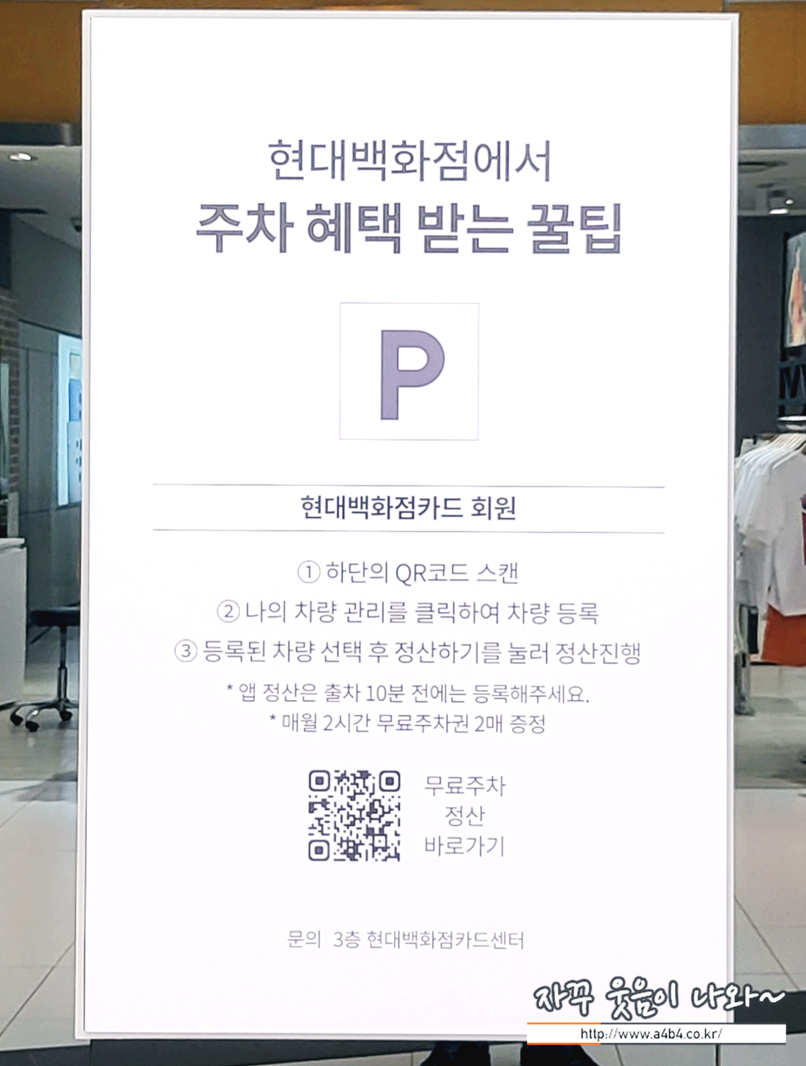 현대백화점 앱을 다운로드 받고 회원가입하면 월 2시간 무료주차권 2장이 지급됩니다.