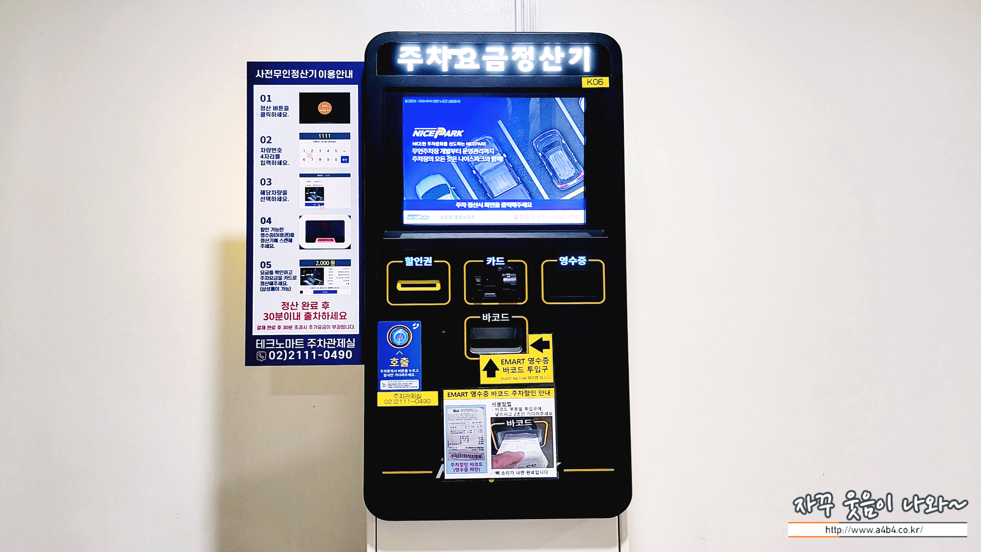 참고로 추차권이 아닌 기기통한 무료주차 처리가 되었다면, 출차시 주차요금 정산기에서 추가 확인하지 마세요. 잔여 주차시간과 상관없이, 확인시점으로 30분 내에 출차하셔야 합니다.