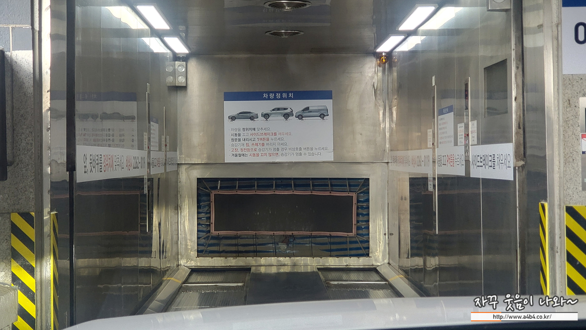 진입하시면 노상 주차장이 아닌 동대문 악세사리 상가 주차 엘리베이터를 타고 건물 옥상으로 이동하는 방식입니다. 사진만 봐도 답답함이 생기는데요. 중형 SUV 기준으로 사이드미러 접고 상당히 긴장하고 진입하게 됩니다.