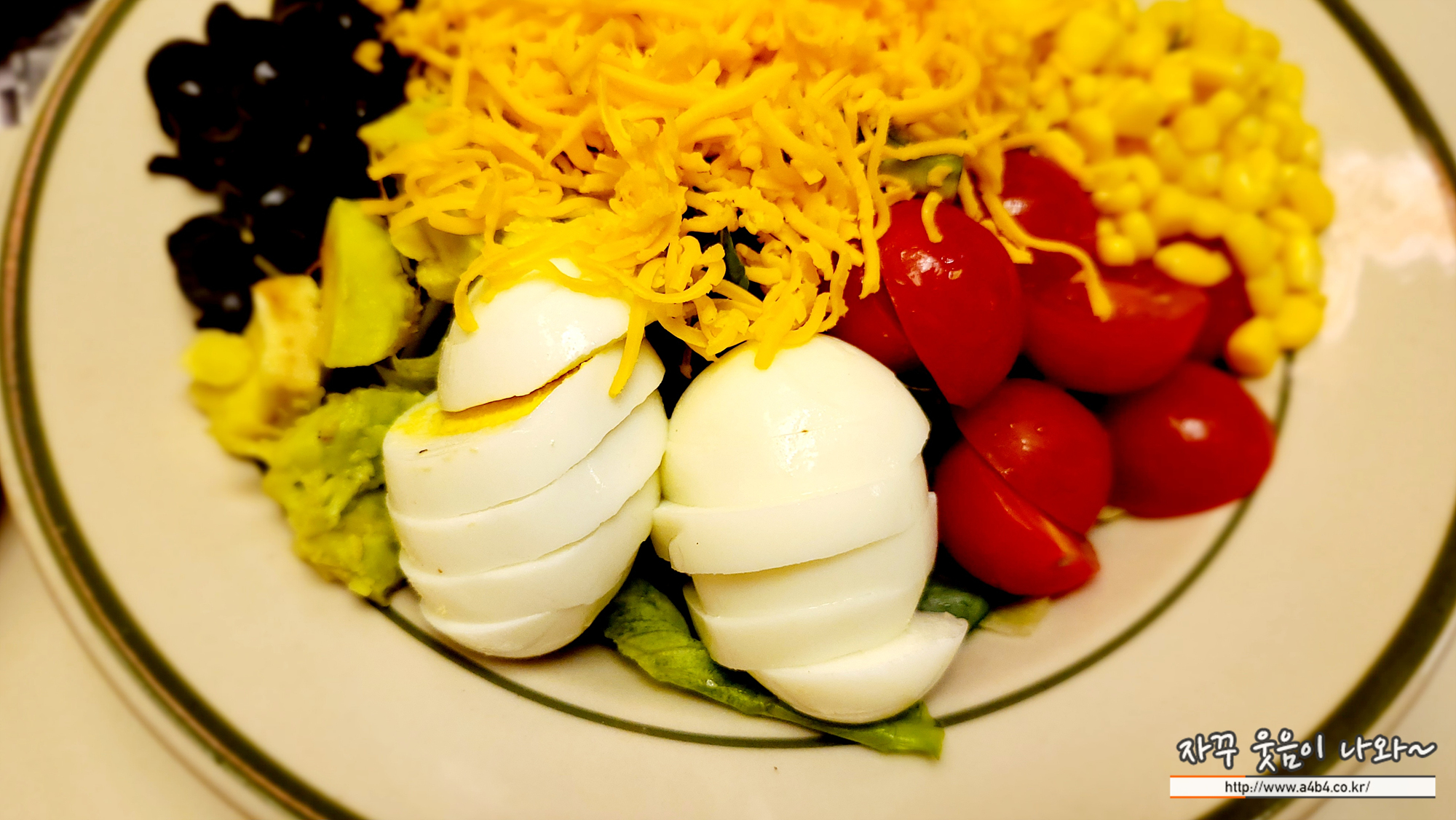 베이컨, 계란, 올리브, 옥수수들이 보이고요. 우선 양은 푸짐하게 올려 있습니다. 콥 샐러드는 항상 맛있다는...