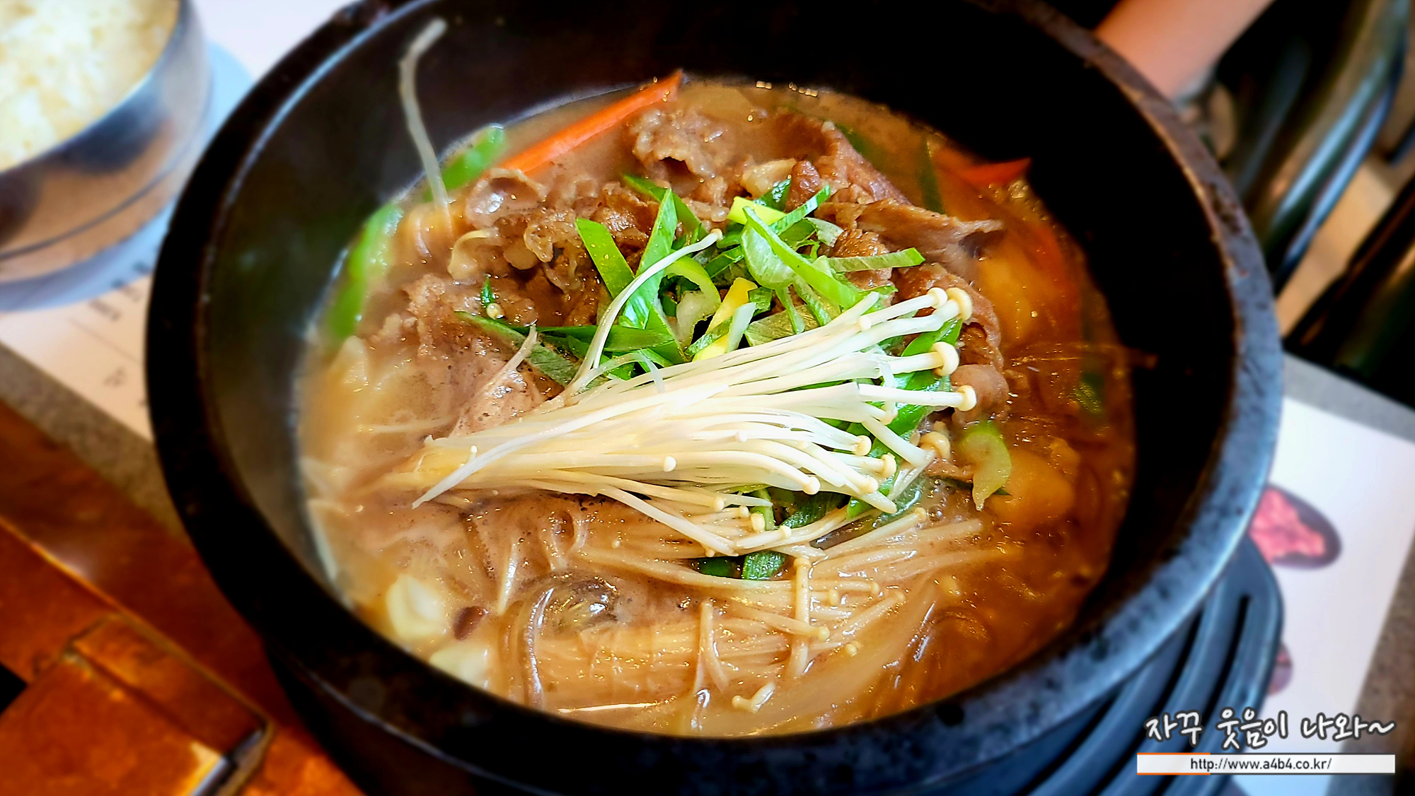 다만 뚝불 국물은 매우 달달합니다. 원래 뚝배기 불고기가 상당히 단 맛을 보이지만, 이곳 돈블랑 뚝불은 매우 달달하다는... 역시나 딸아이 밥 말아 드시네요. 아이들이 좋아할 메뉴네요.