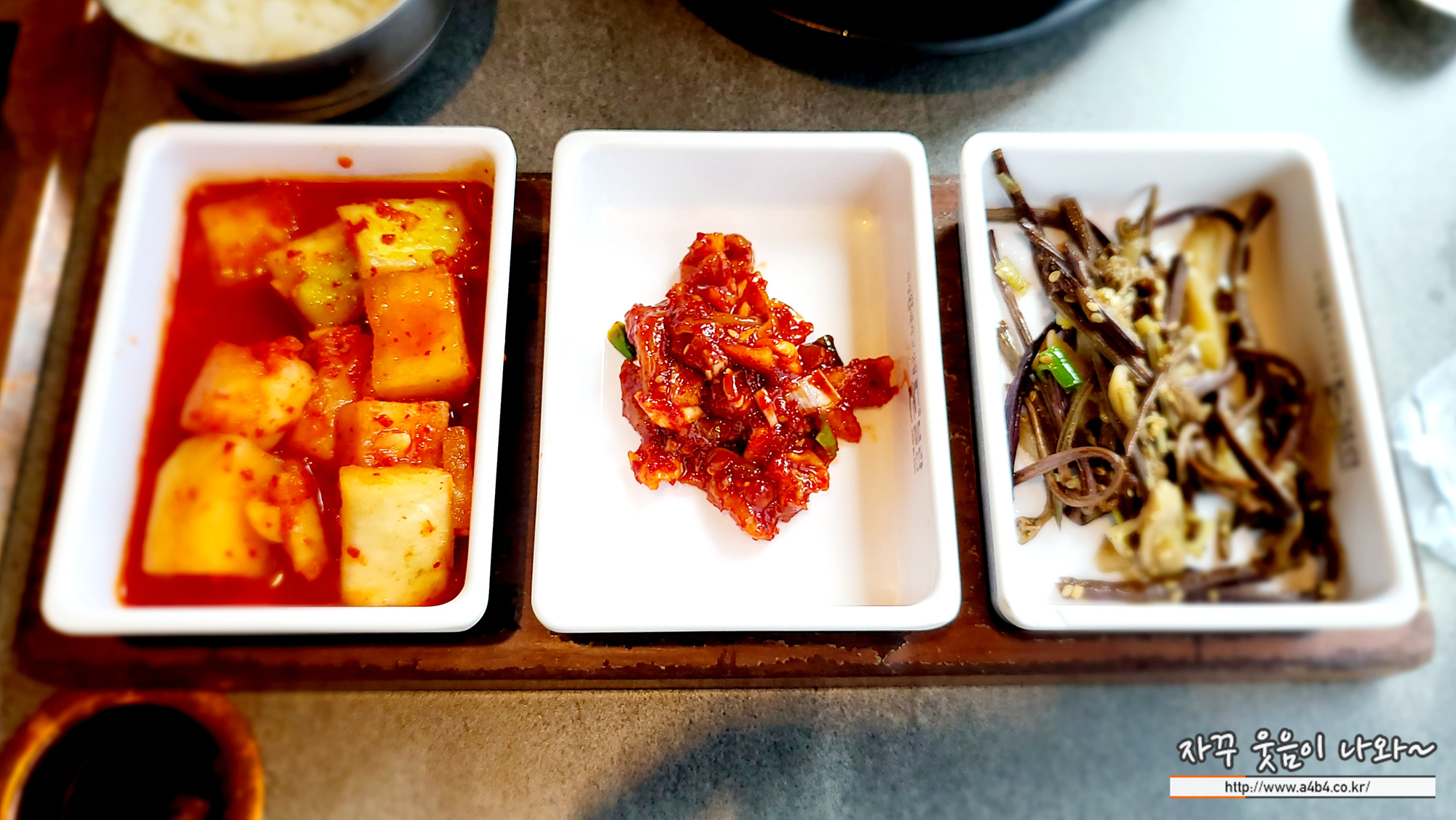 저희는 점심 정식을 주문했고 반찬은 사진과 같이 깍뚜기와 오징어젓, 고사리, 생양파가 나옵니다. 물론 부족하면 친절하게 리필도 가능합니다. 반찬들 모두 맛있고요.