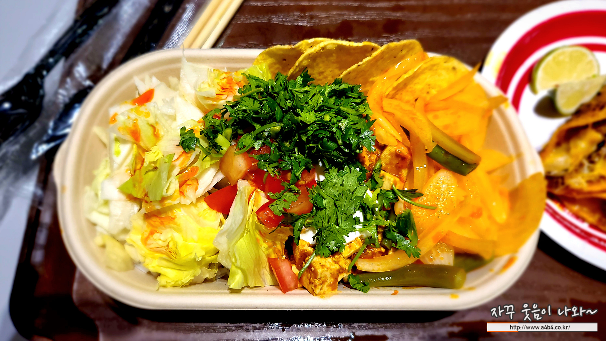 매콤한 치폴레 소스로 맛을 낸 두부와 풍부한 야채, 그리고 안남미를 곁들인 샐러드 아닌 샐러드 입니다. 제가 좋아하는 양파요리와 안쪽에는 두부와 밥이 있는데요. 생각보다 맛있는 메뉴입니다.