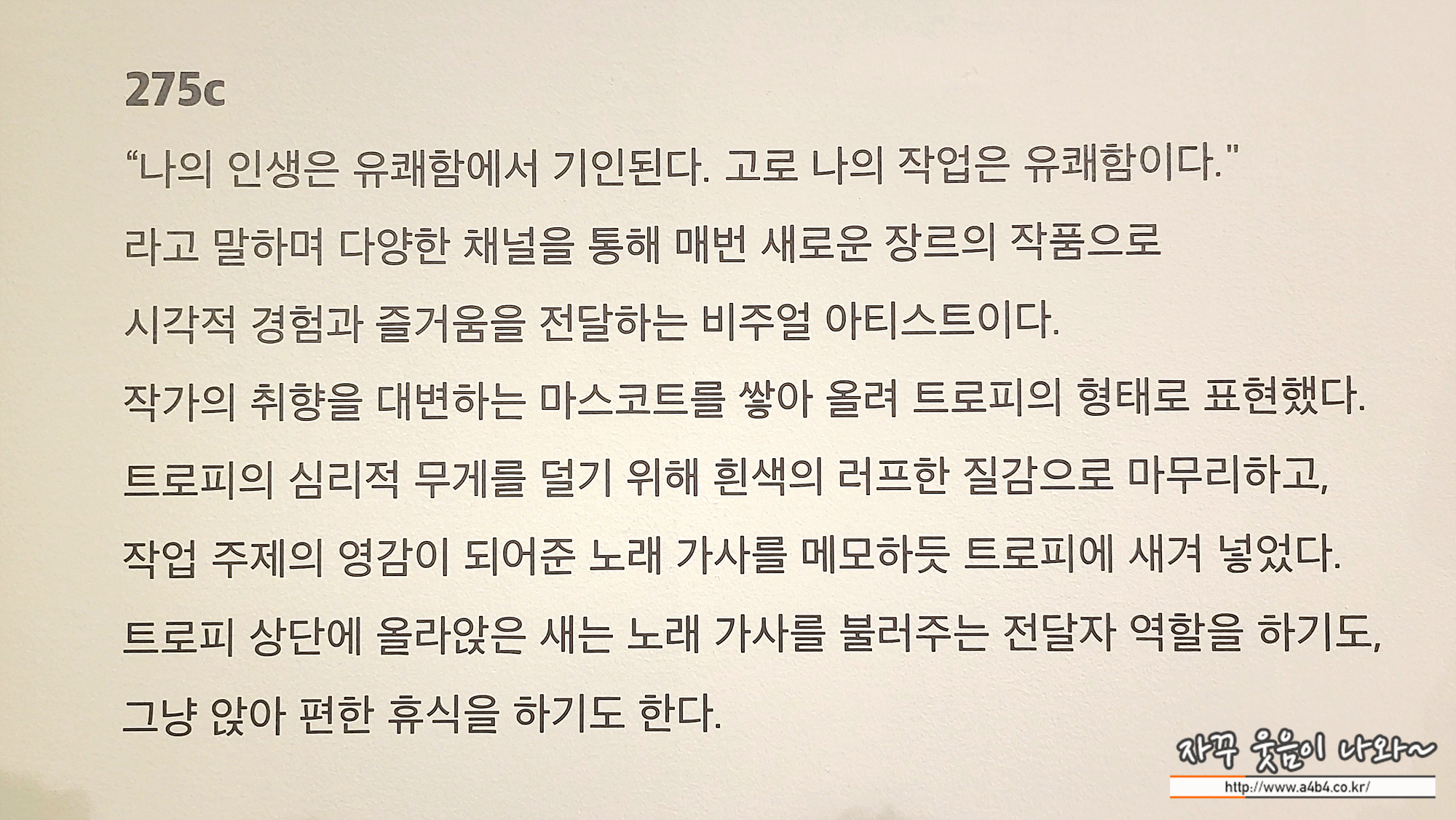 작가의 취향을 대변하는 마스코트를 쌓아 올려 트로피의 형태로 표현했다 트로피의 심리적 무게를 덜기 위해 흰색의 러프한 질감으로 마무리하고, 작업 주제의 영감이 되어준 노래 가사를 메모하듯 트로피에 새겨 넣었다. 트로피 상단에 올라았은 새는 노래 가사를 불러주는 전달자 역할을 하기도 그냥 앉아 편한 휴식을 하기도 합니다.