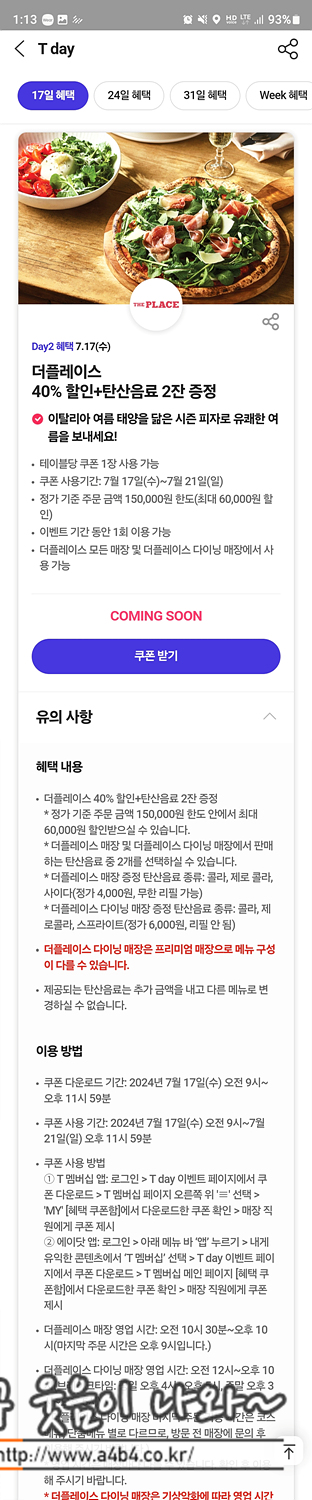 이번 SKT T day 3주차 혜택으로 The Place 40% 할인에 탄산음료 2잔 무료쿠폰이 나왔습니다.