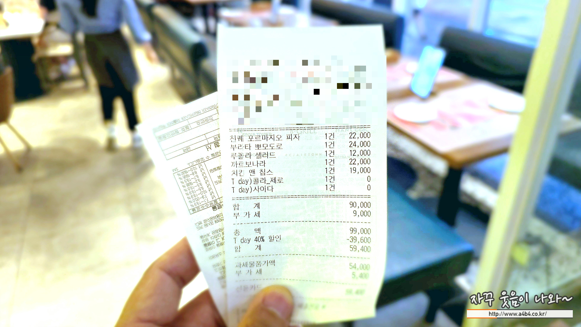 가격은 총 59,400원으로 이탈리안 음식점에서 3명이 먹은 것으로는 상당히 저렴하게 나왔네요. 물론 T day 40% 할인이 가장 큰 이유지만...