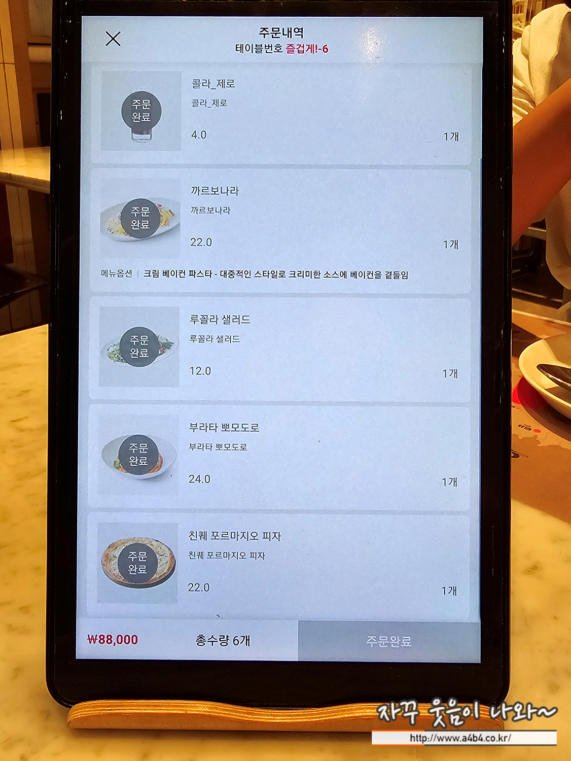 주문은 이렇게 테이블 위의 태블릿에서 하시면됩니다. 별도 메뉴판은 없습니다.