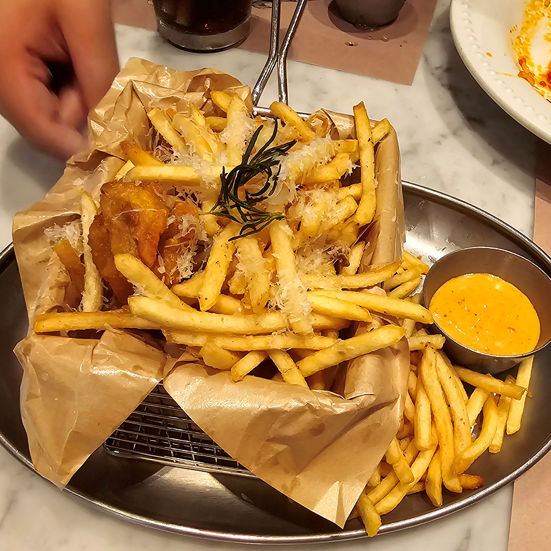 치즈가 얹어진 감자튀김은 조금만 더 통통했으면 식감이 더 좋았을 것 같은데. 다소 마른 감자는 아쉬웠네요.