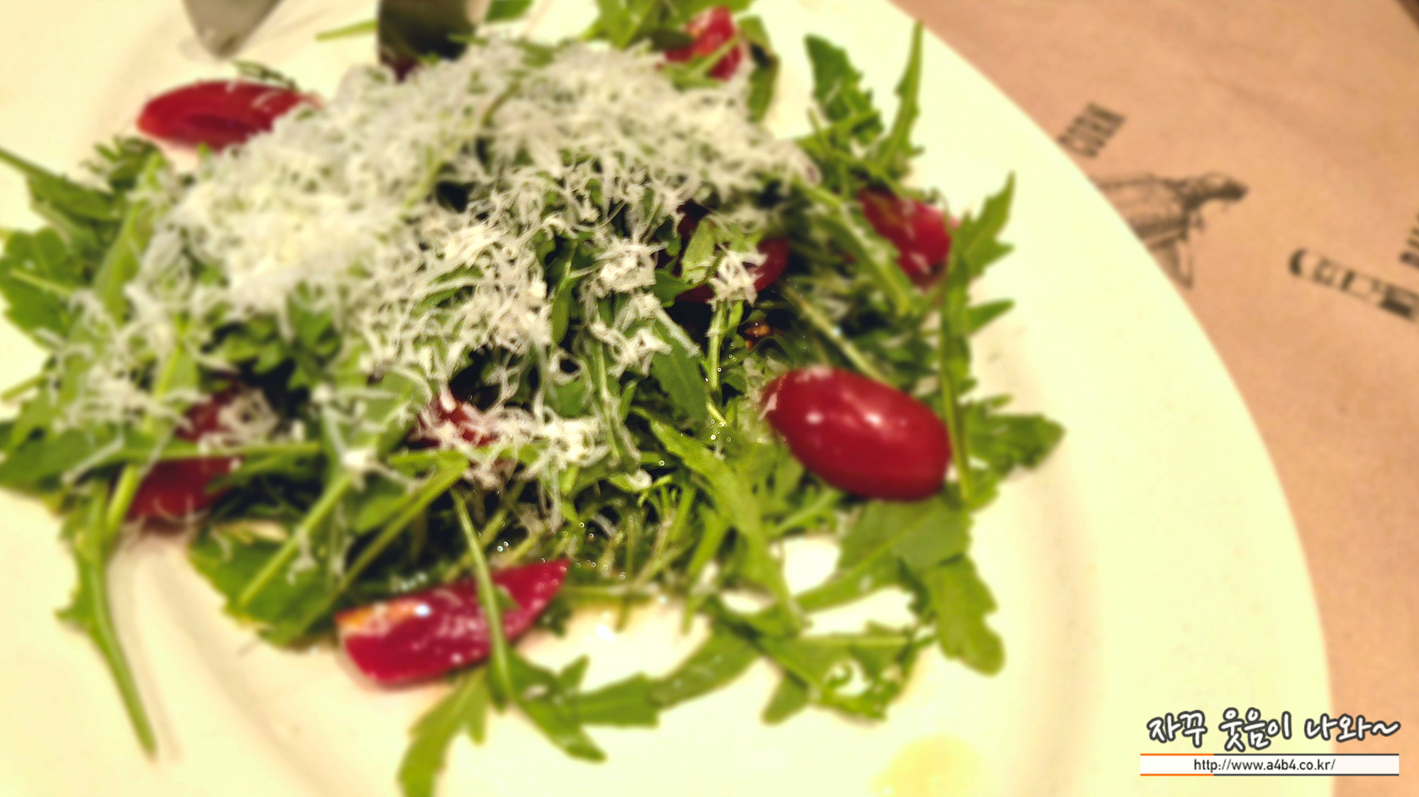 첫 서빙된 음식이 루꼴라 샐러드인데요. 양이 너무 적어서 실망했네요. 서빙받은 모양에서 손 안 대고 찍은사진 입니다.