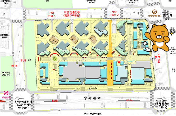 파크하비오 전체적인 구성은 아래와 같고요. 뒷길로 오시면 지하에서 익숙하지 않은 길을 가셔야 하기에 라이언이 있는 4번 차량 출입구 추천 드립니다.