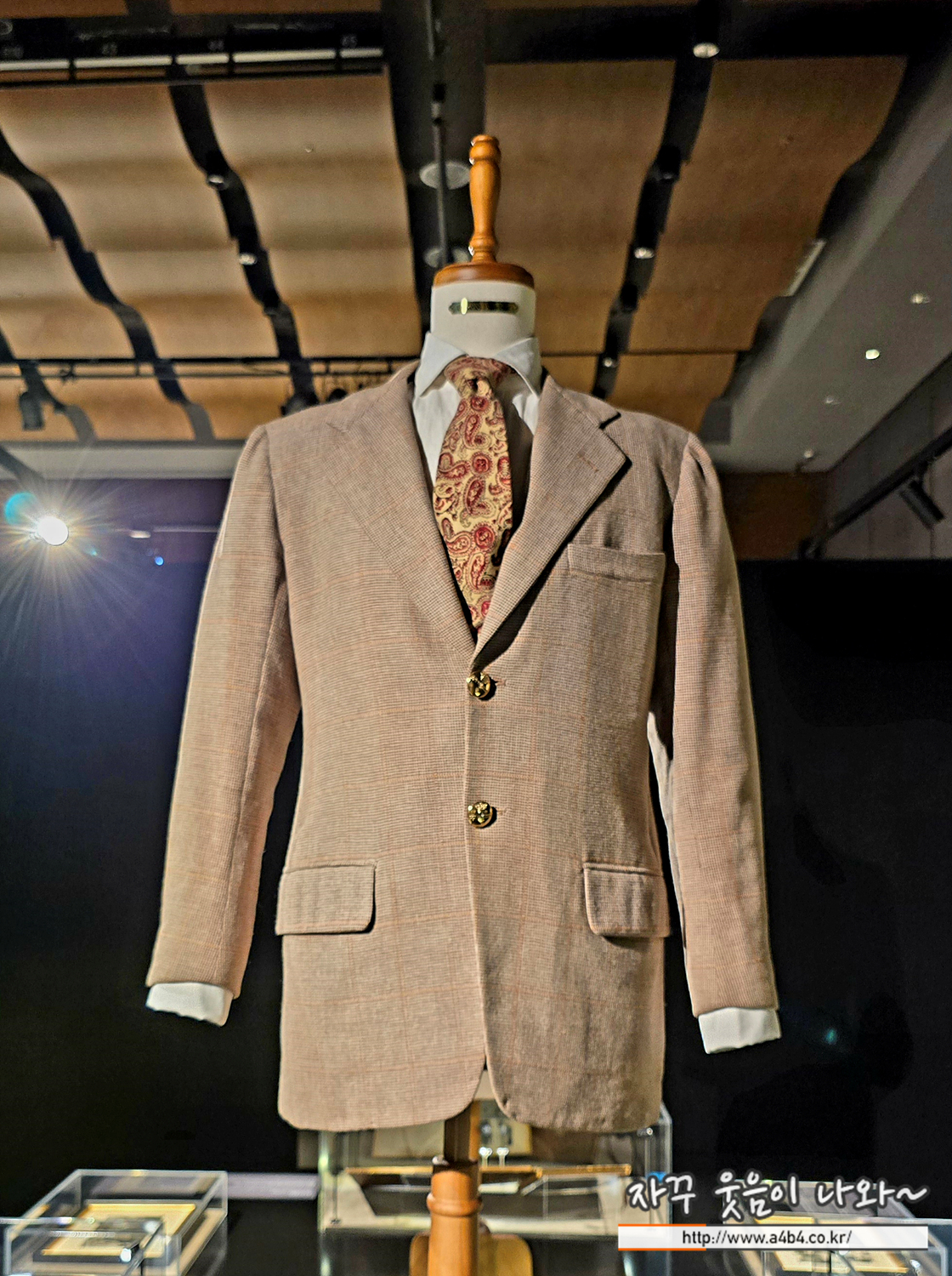 윈저 공은 자신만의 넥타이 매듭법을 고안했을 정도로 창의적인 패션 감각의 소유자였다. 두툼하고 단단한 윈저 공의 매듭법 은 현재에도 '윈저 노트(Windsor Knot)'로 불린다. 윈저 공의 패 션을 엿볼 수 있는 이 슈트는 고급 해리스 트위드 울 원단으로 만 든 싱글 버튼 재킷, 화이트 셔츠, 그리고 노란색 페이즐리 넥타이로 구성되어 있다. 셔츠와 넥타이는 1913년 창업해 지금도 성 업 중인 호스 앤 커티스 사의 제품이다. 1964년 컬럼비아 사에 서 제작한 다큐멘터리 <킹스 스토리>에서도 이 재킷과 넥타이 를 착용했다.