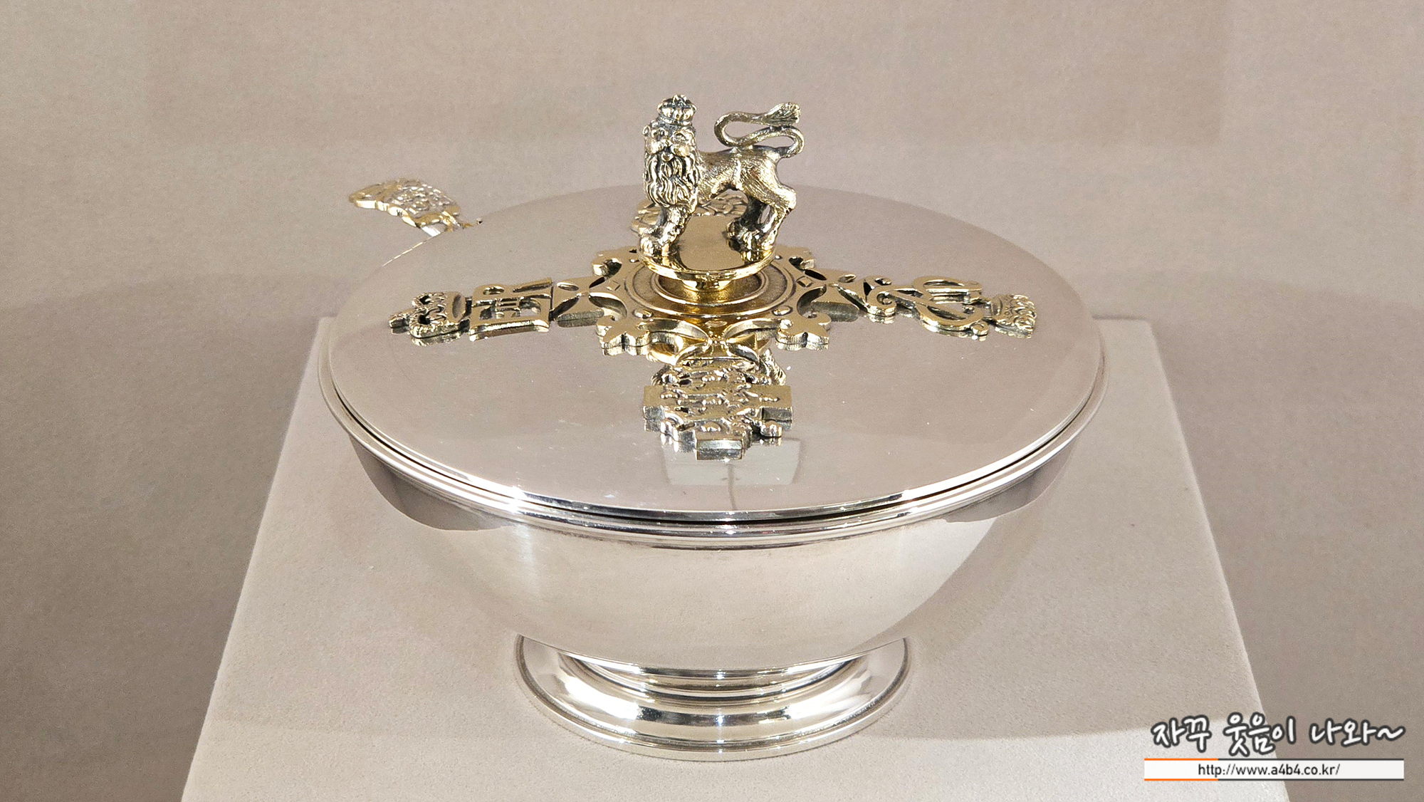 이 은식기는 당시 은혼식 기념을 위한 것으로, 미국 유명 배우 셜 리템플이 소유했던 것이며, 금박을 입힌 사자 장식의 은그릇과 스 푼에 왕실 문장이 새겨져 있다. 그릇 밑면에는 한정 제작을 알리 는 No. 84가 표시되어 있다.