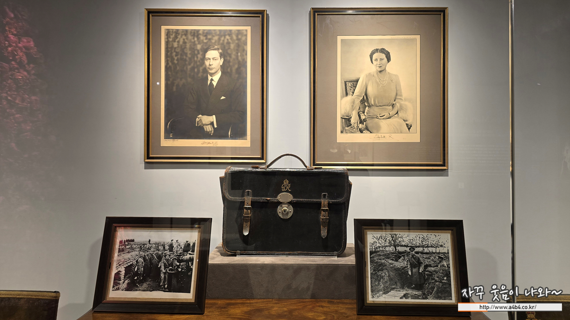 "친애하는 국민 여러분, 우리 앞에 놓인 이 어두운 시간이 우리 역 사상 가장 중요한 시기가 될지 모릅니다.' 마지막 순간까지 전쟁을 피하고자 했던 영국은 결국 독일에 선전 포고를 하며 제2차 세계 대전에 참전했다. 전쟁 중 조지 6세는 버 킹엄 궁전과 윈저 성을 끝까지 지키며 국민들의 정신적 지주가 되 었다. 1945년 스무 살의 엘리자베스 공주 역시 보급용 군용 트럭 을 모는 운전병으로 참전해 영국 왕실의 노블레스 오블리주 정신 을 널리 알렸다. 이 가방은 전쟁 중 조지 6세가 사용한 것으로, 경 매 당시 안쪽 주머니에서 국민들과 함께 촬영한 기념사진이 발견 되었다. 항상 국민과 함께 했던 조지 6세의 면모를 볼 수 있다