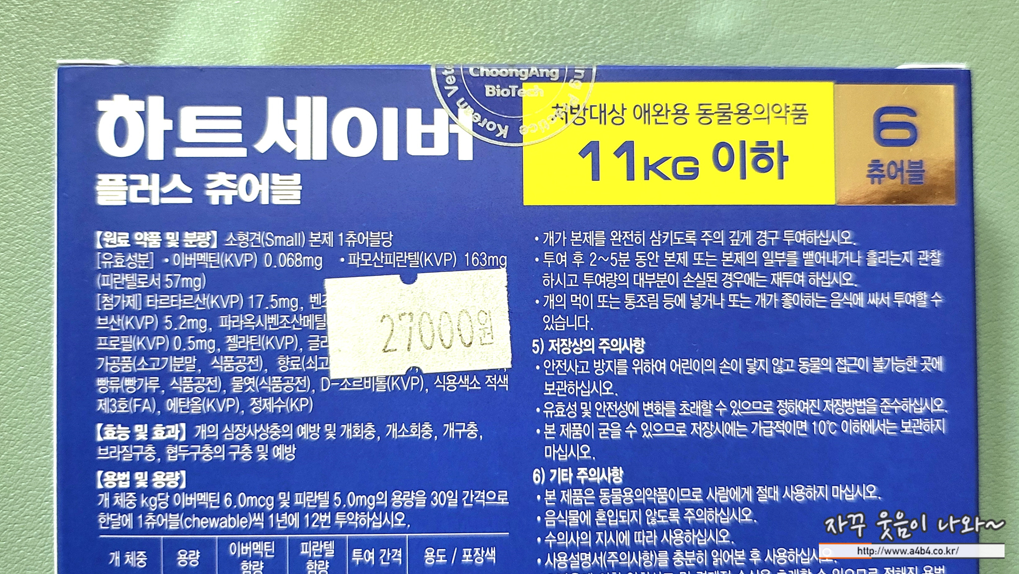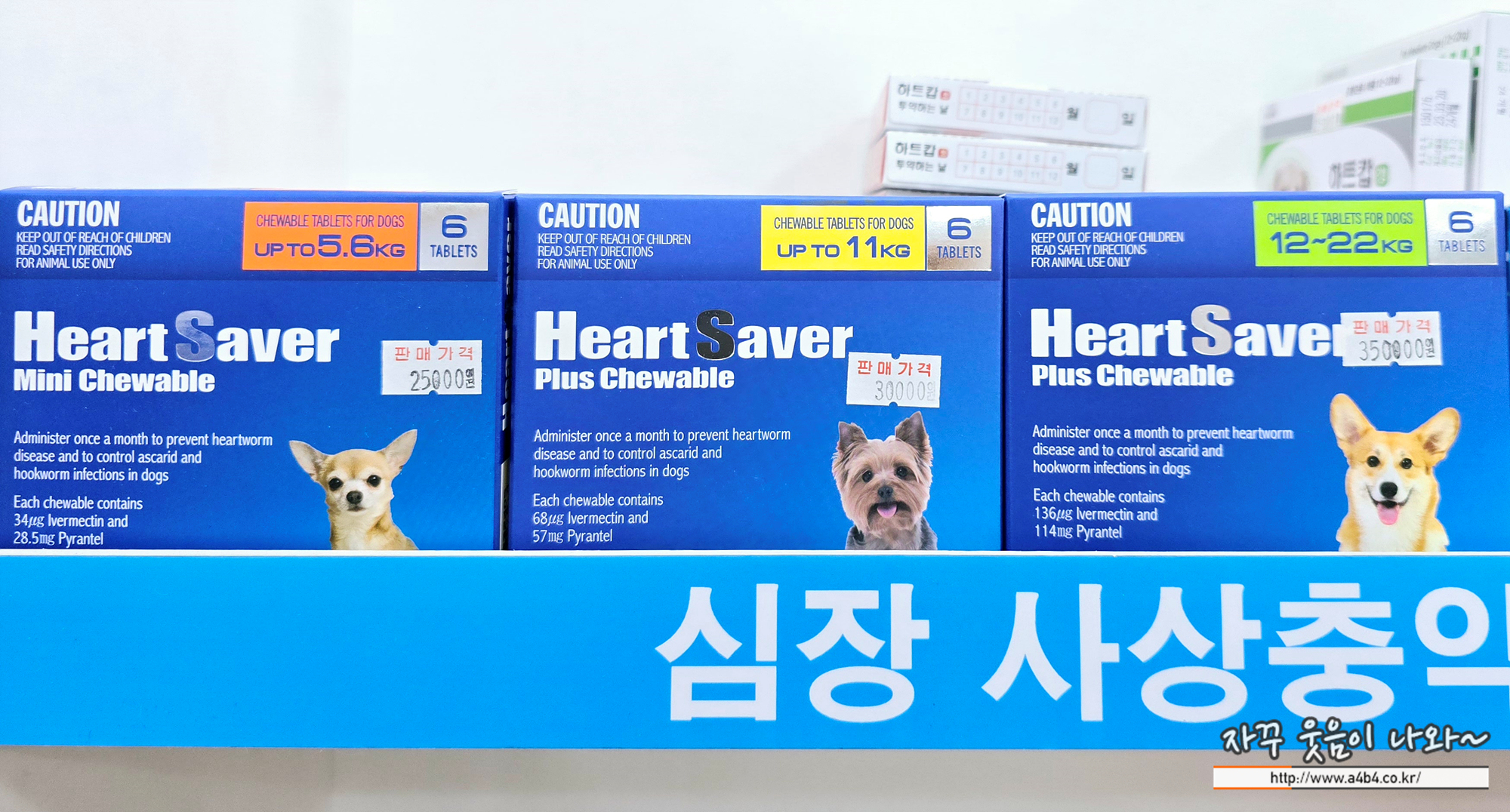 제가 사는 동네 근처 약국 두 곳에서 가격을 비교해 봤더니 하트세이버 11kg 기준으로 한 곳은 27,000원 다른 한 곳은 30,000원으로 가격차이가 나고 있네요. 뭐 한 달에 500원 차이로 볼 수 있지만, 이왕이면 저렴한 곳이 좋겠죠.