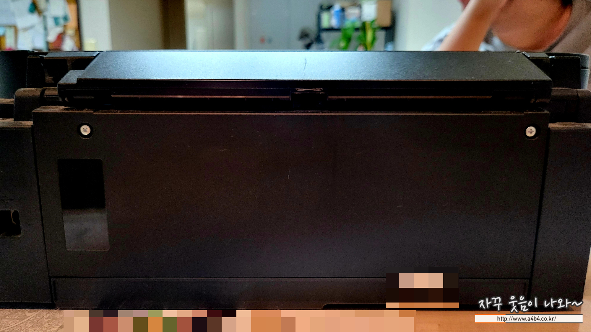 이렇게 캐논 프린터 헤드청소를 하면서 사용되는 잉크가 프린터 뒷부분 앱소번트 패드로 잉크를 흘리게 됩니다.