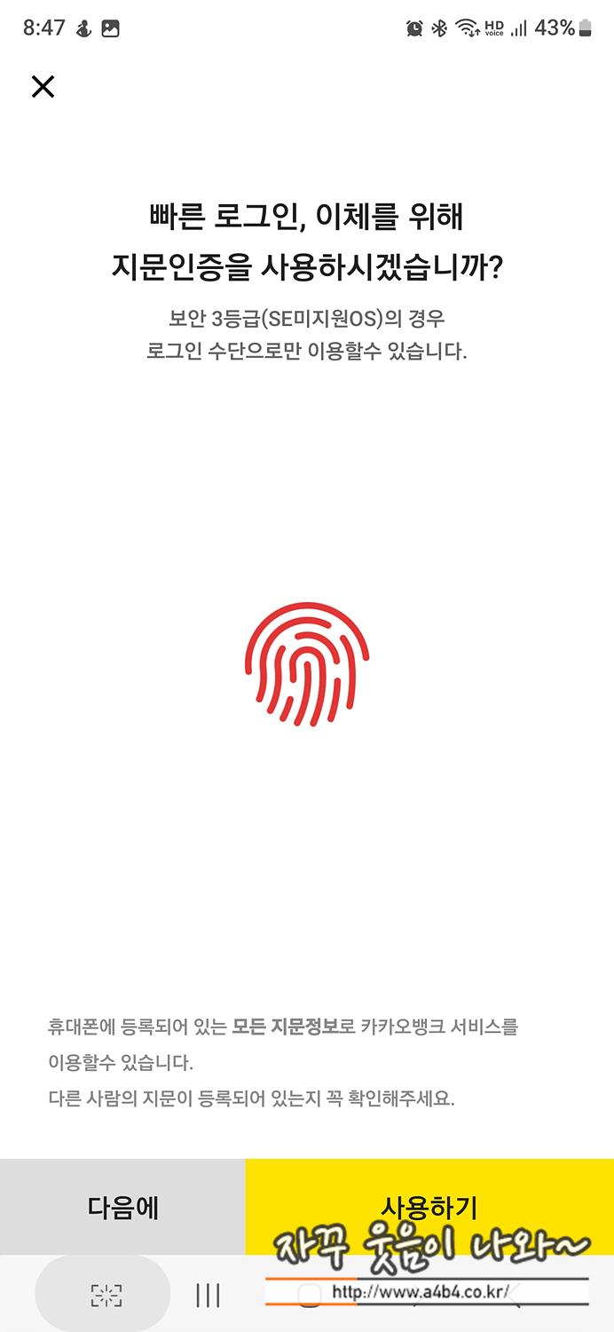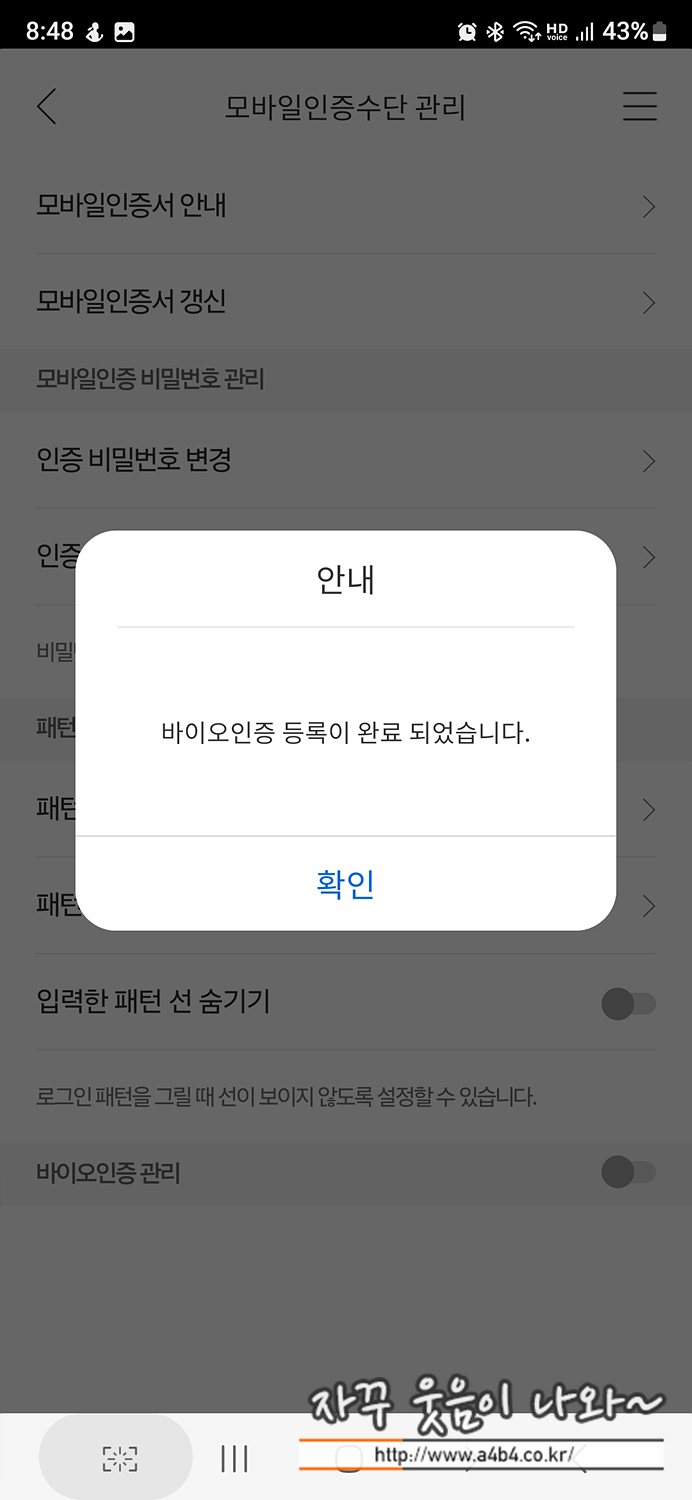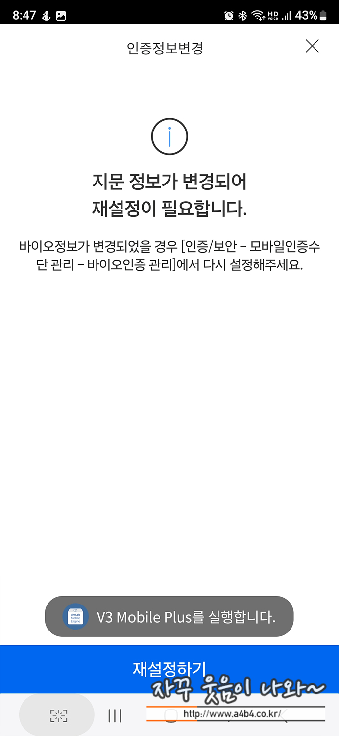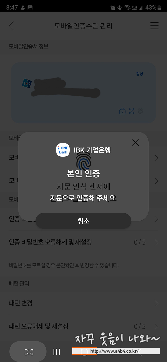 기존지문을 삭제하고 재등록하다 보니, 바이오인증을 사용하는 앱 세팅이 다시 필요합니다.