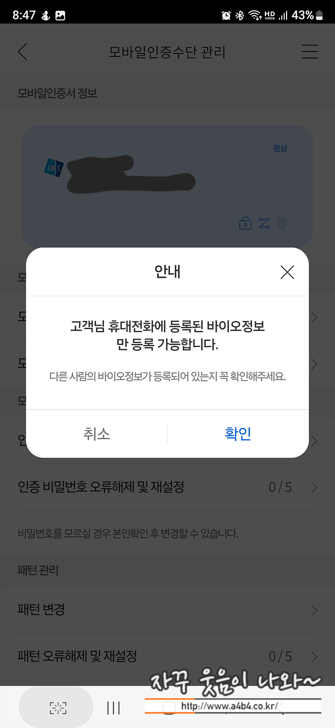 기존지문을 삭제하고 재등록하다 보니, 바이오인증을 사용하는 앱 세팅이 다시 필요합니다.