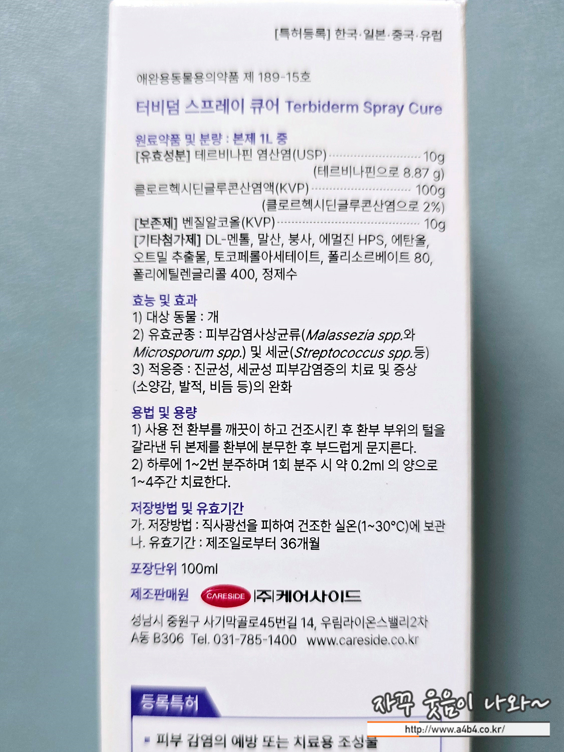 동물약품 전문회사인 케어사이드에서 나온 ' 터비엄 스프레이 큐어'입니다. 강아지 곰팡이성, 세균성 피부감염에 효과적인