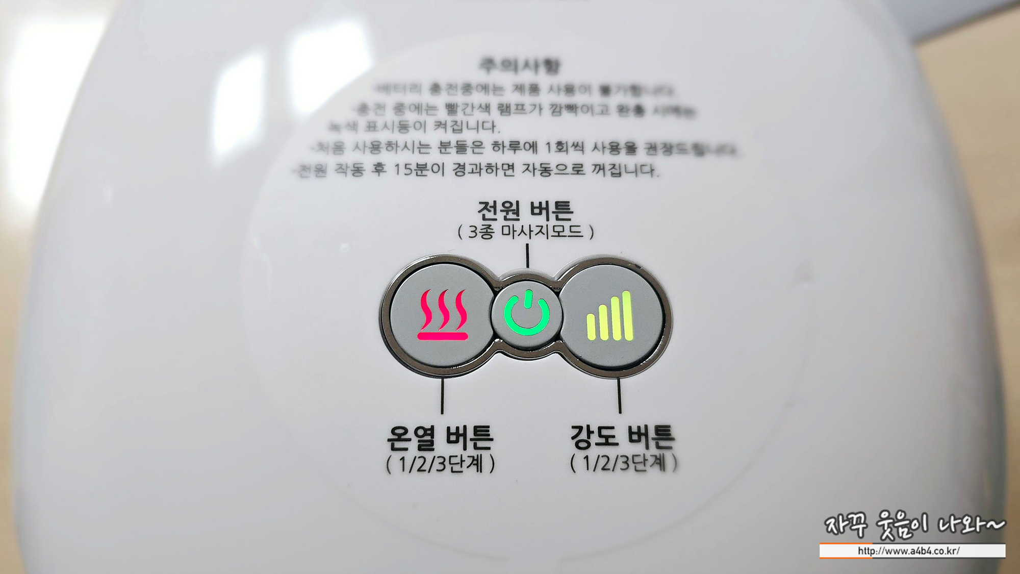 색상은 흰색 핑크 검정 등이 있고요. 상단 부분에는 전원 버튼과 마사지 강도 및 온열마사지 온도조절 버튼이 위치해 있습니다.