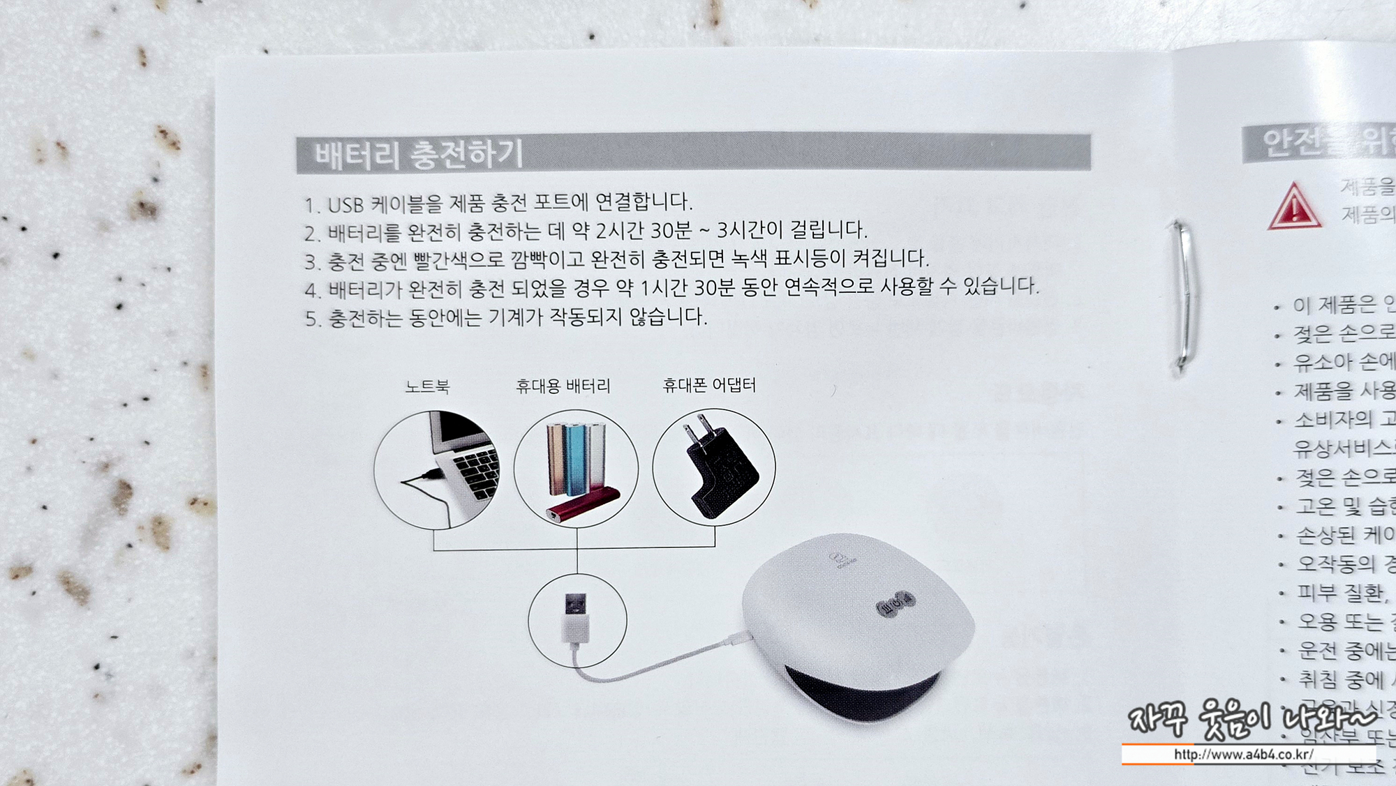 제품구성은 심플합니다. 마시지기에 붙이라고 들어있는 스티커와 핸드 마사지기 본체, 그리고 간단설명서와 USB 충전케이블이 포함되어 있습니다.