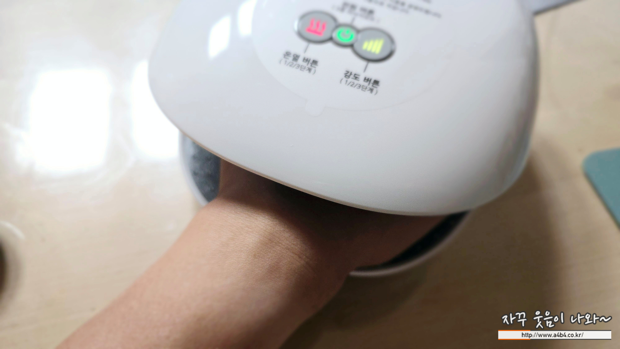 이렇게 손을 넣고 상단 온열버튼을 누르면 컴피어 손마사지기 온열 기능이 작동하게 되는데요.