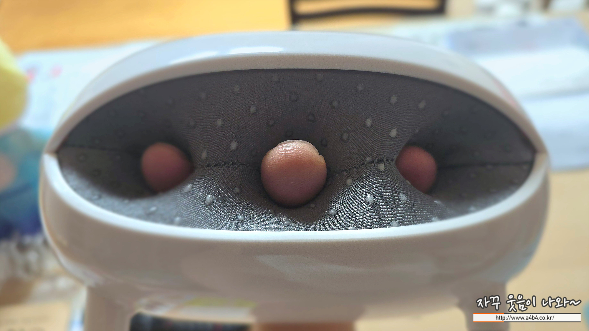 손가락 마사지기 안쪽에는 지압돌기 처리되어 있고요. 안쪽으로 손을 넣고 아래 사진 구멍으로 손가락 앞부분을 빼 줍니다. CF-4803-KR 컴피어 손마사지기는 여성분들에게 맞게 설계된 제품인 것 같습니다. 제가 손이 큰 편은 아닌데요. 다소 작은 느낌이 들었습니다. 마사지 받는데, 강도를 약하게 해도 손가락이 아퍼 사용하기 어렵네요. 마눌님은 잘 맞는다 하시네요.