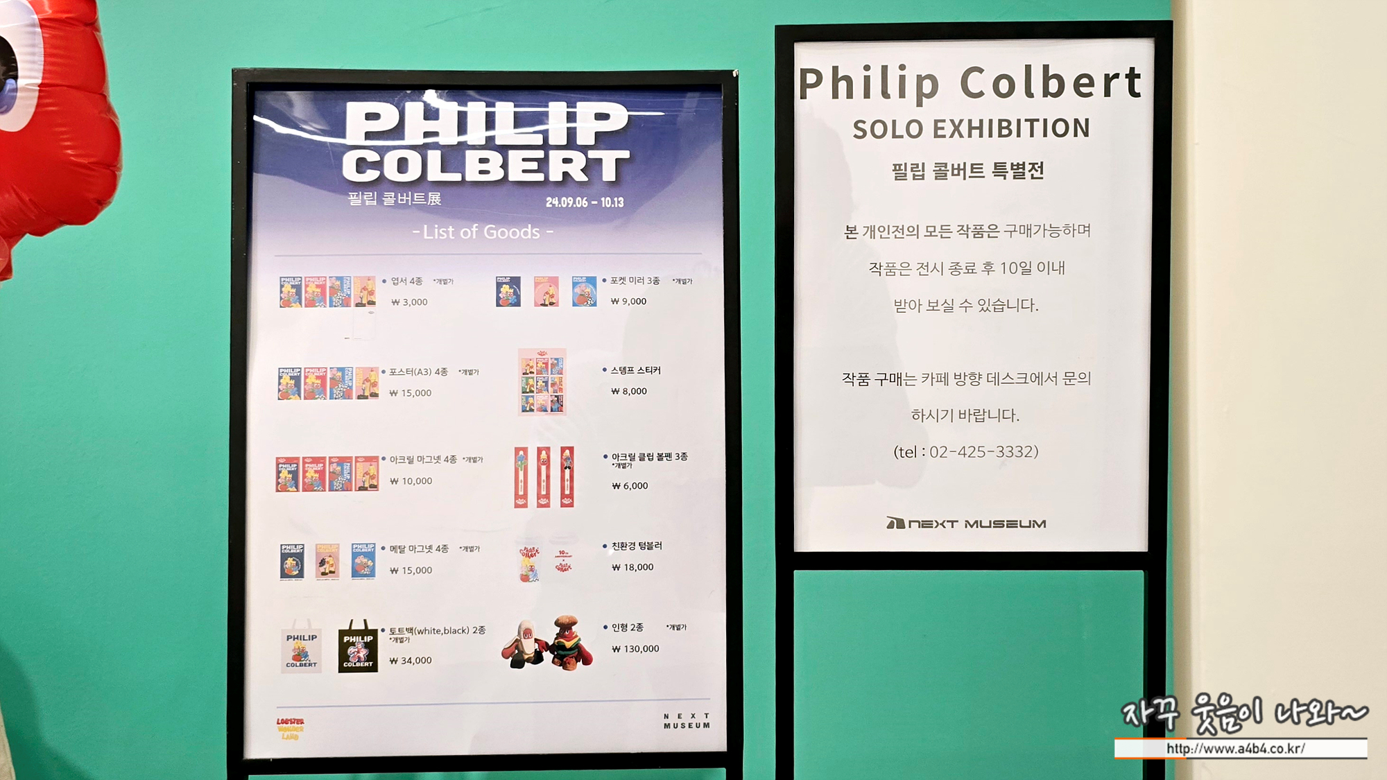 잠실 넥스트 뮤지엄에서 열리고 있는 필립 콜버트 특별展에서는 작가의 다양한 굿즈를 만나볼 수 있습니다. 포스터 및 옆서, 에코백, 뱃지, 필기구, 스티커, 인형 등을 만나볼 수 있습니다.