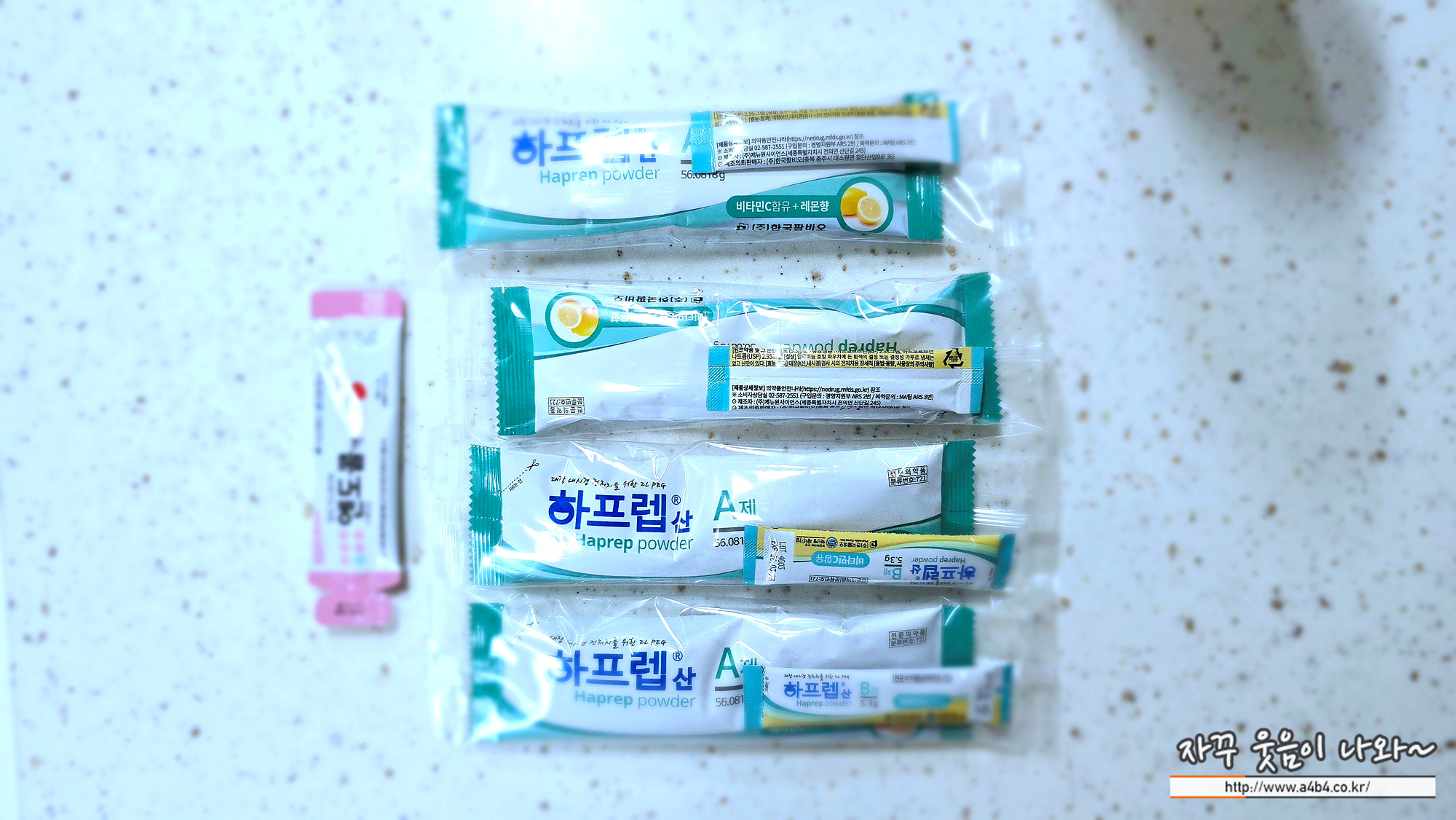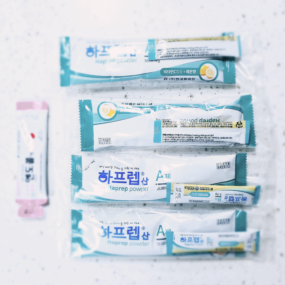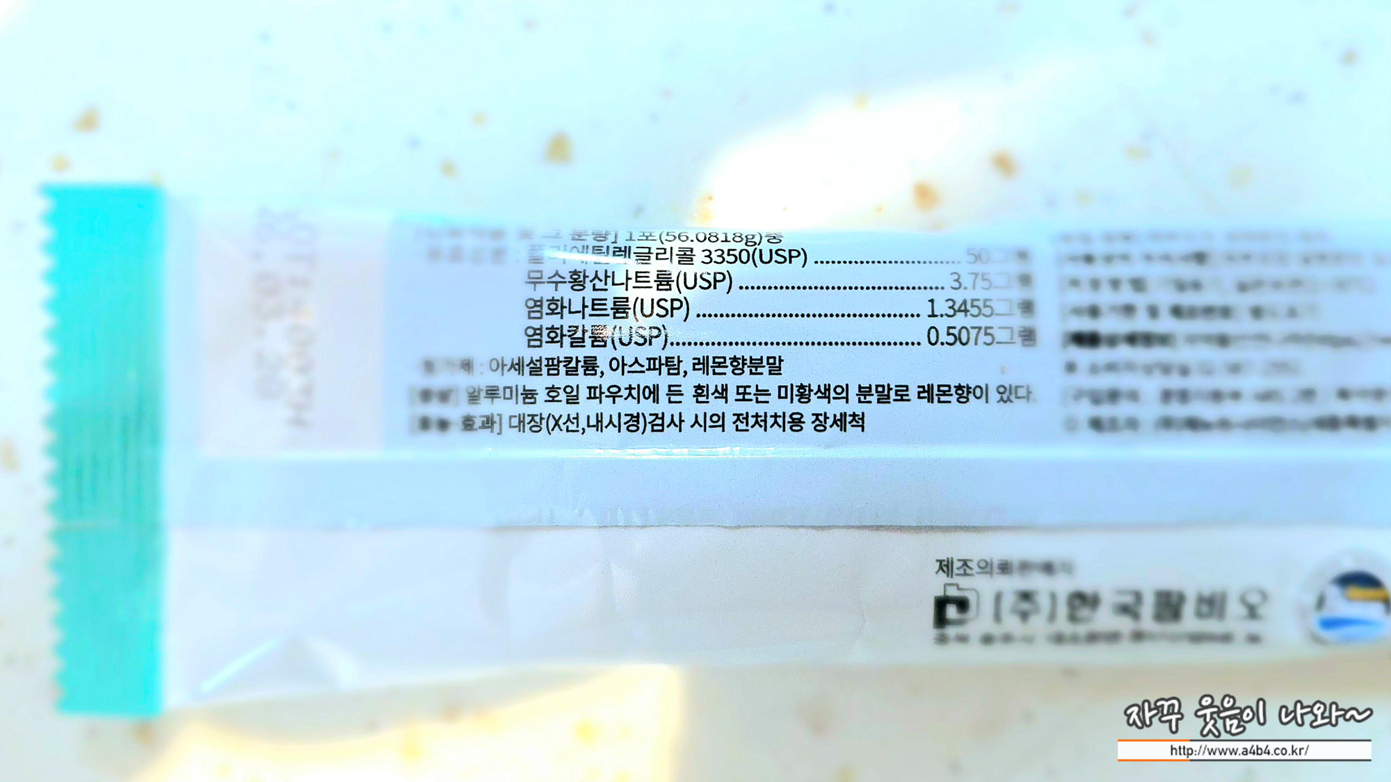 무색의 레몬향이 첨가된 화학약품입니다. 주 성분은 폴리에틸렌글리콜 인데요. 좀 더 강한 화학적인 변비약인 것 같습니다. B제는 아스코르브산이 주된 성분으로 보이는데, 화학적인 비타민 C 같네요.